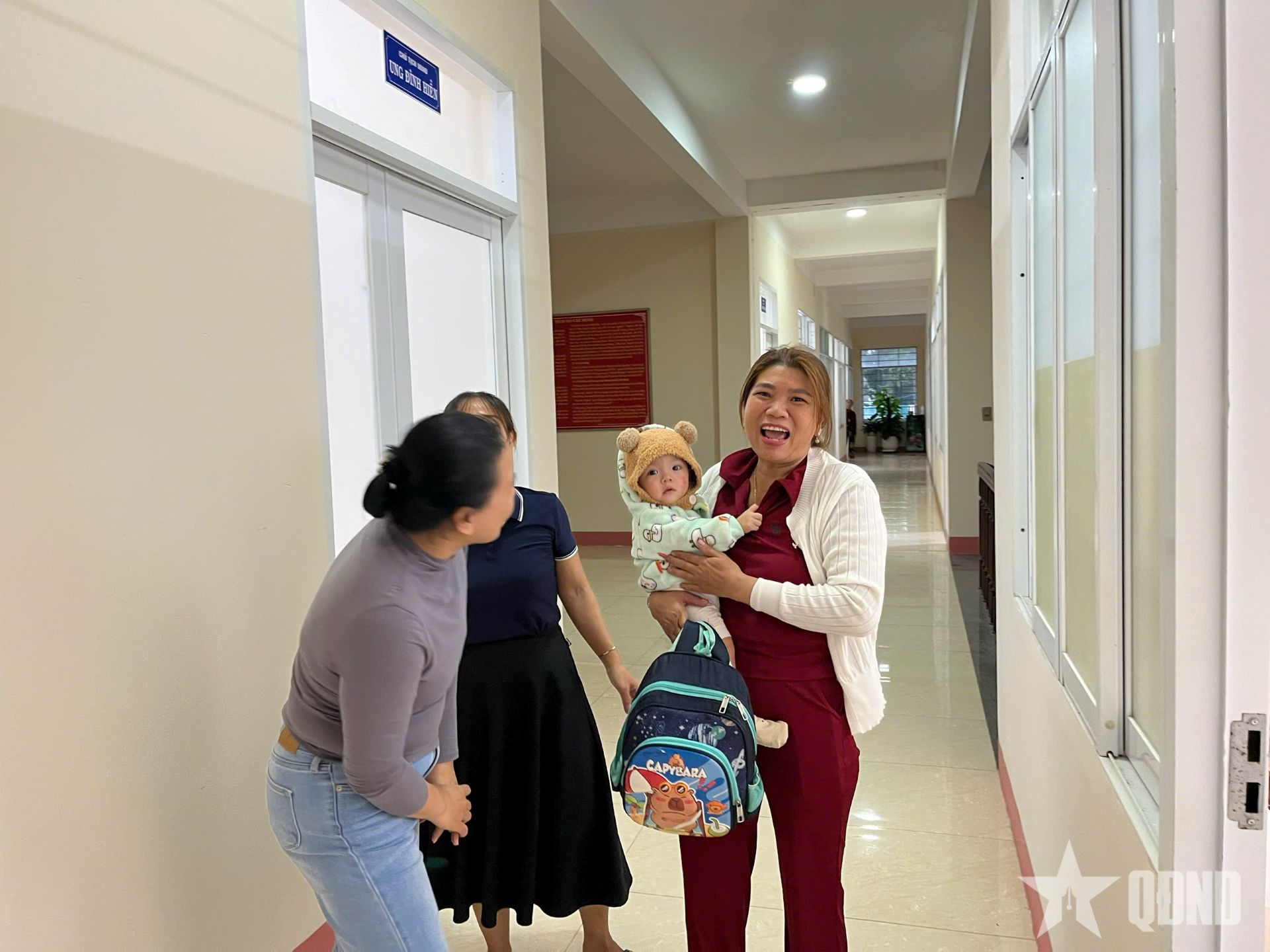Chị Bùi Thị Lan cùng con nhỏ ở thôn An Lộc Bắc, xã Vạn Tường, tỉnh Quảng Ngãi, được cán bộ phụ nữ xã đón và bố trí phòng riêng vì có con nhỏ.