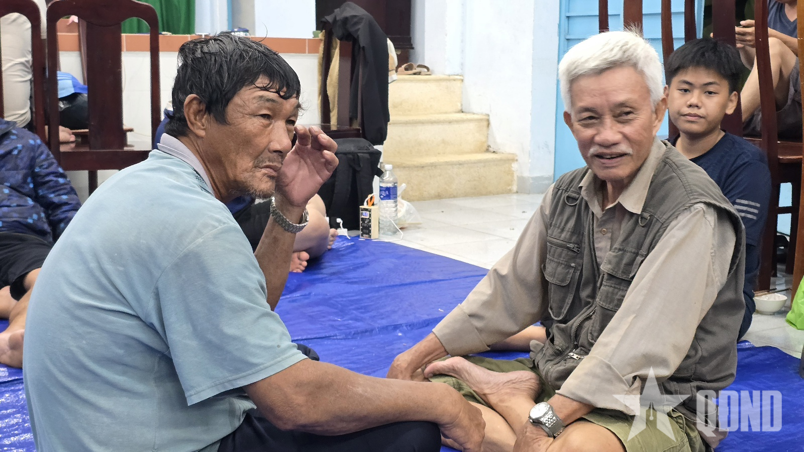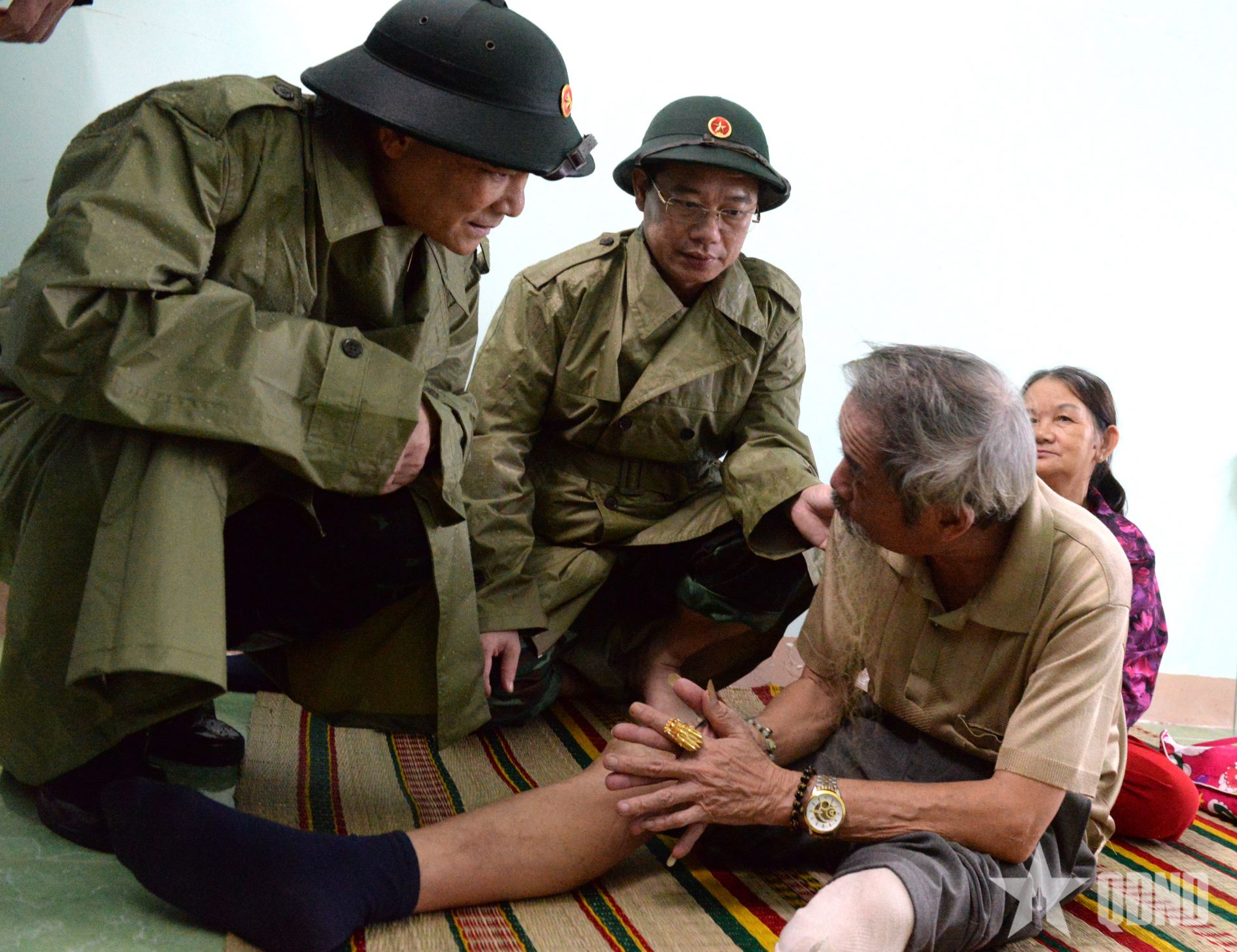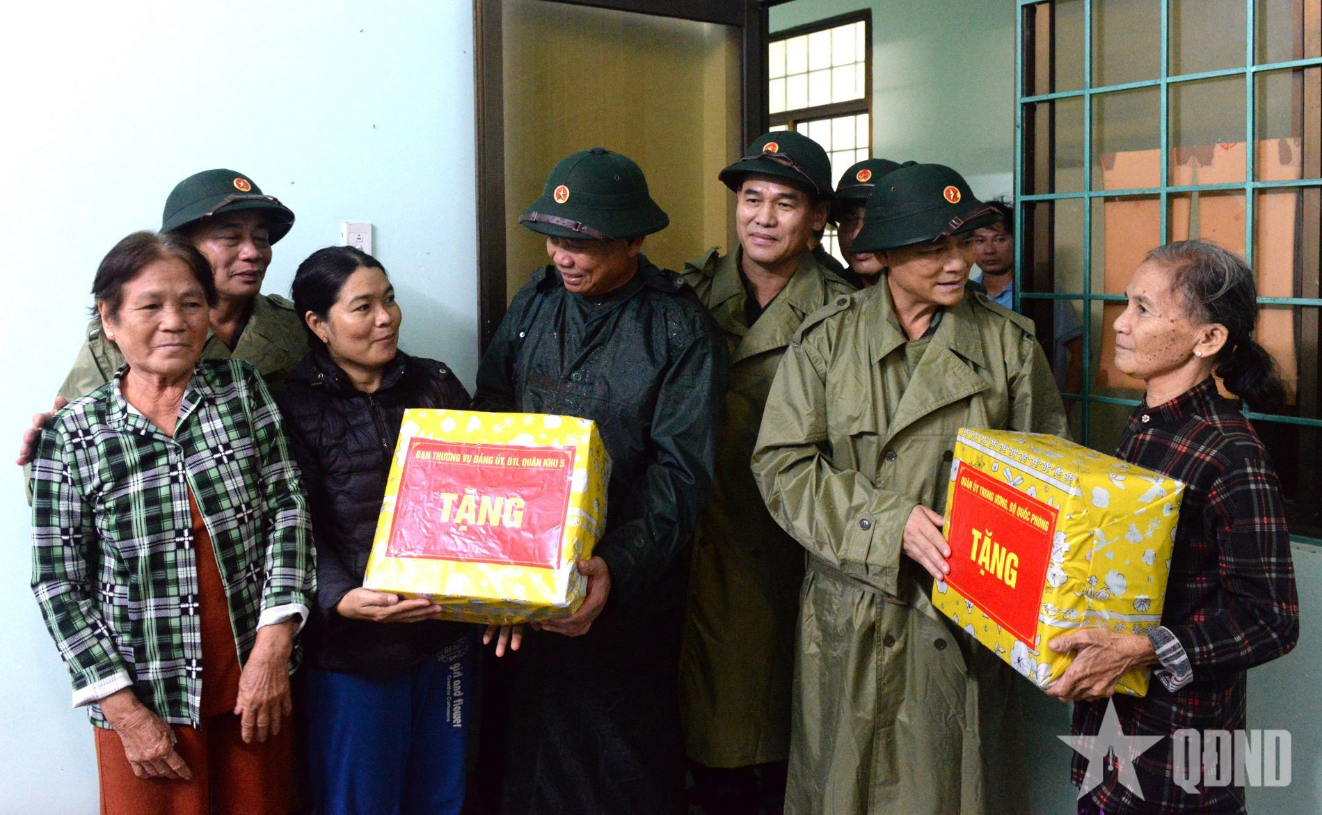 Thượng tướng Phạm Trường Sơn, Phó tổng Tham mưu trưởng Quân đội nhân dân Việt Nam (bên phải) và Thiếu tướng Hứa Văn Tưởng, Phó tư lệnh Quân khu 5 động viên, tặng quà người dân phường Đức Phổ đến tránh trú bão tại khu vực tập trung.