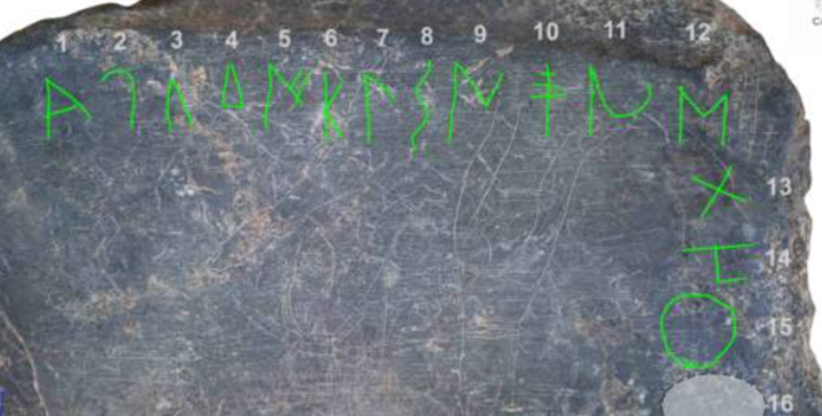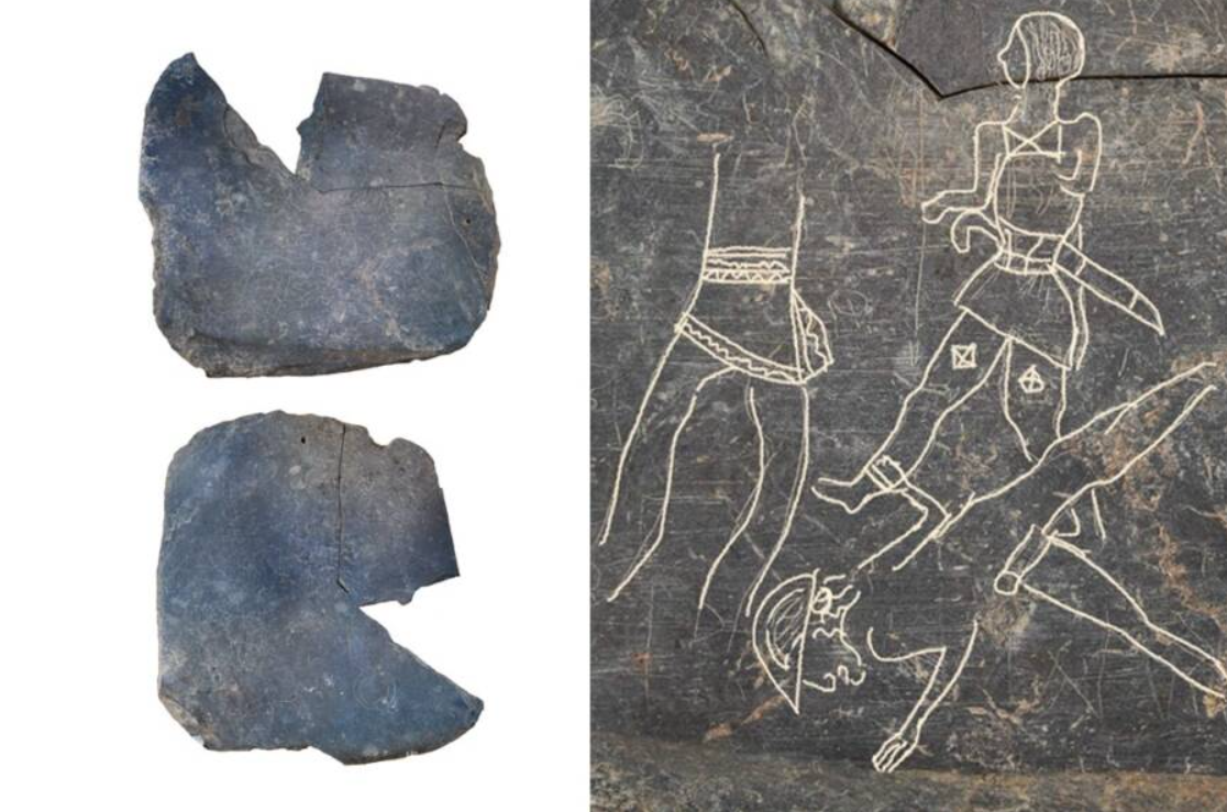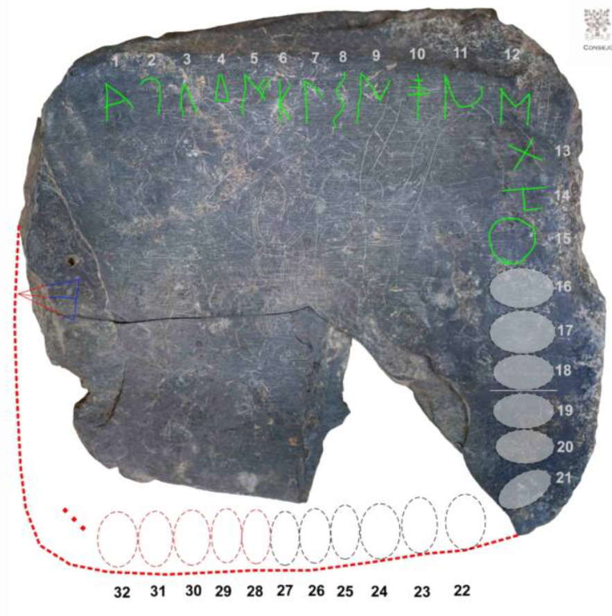 Ngoài cảnh chiến đấu, trên phiến đá còn ghi chú “một chuỗi 21 ký hiệu” được cho là thuộc về “bảng chữ cái của một hệ thống chữ viết Paleo-Hispanic phía nam” bí ẩn. Ảnh: @Bảo tàng Quốc gia Tây Ban Nha.