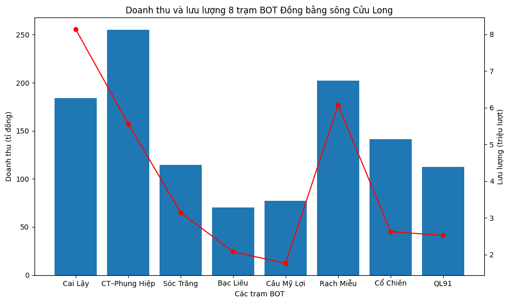 Doanh thu và lưu lượng tám dự án BOT ở ĐBSCL 11 tháng đầu năm 2025. Trong đó, cột xanh là doanh thu, đường đỏ là lưu lượng xe. Trung Chánh