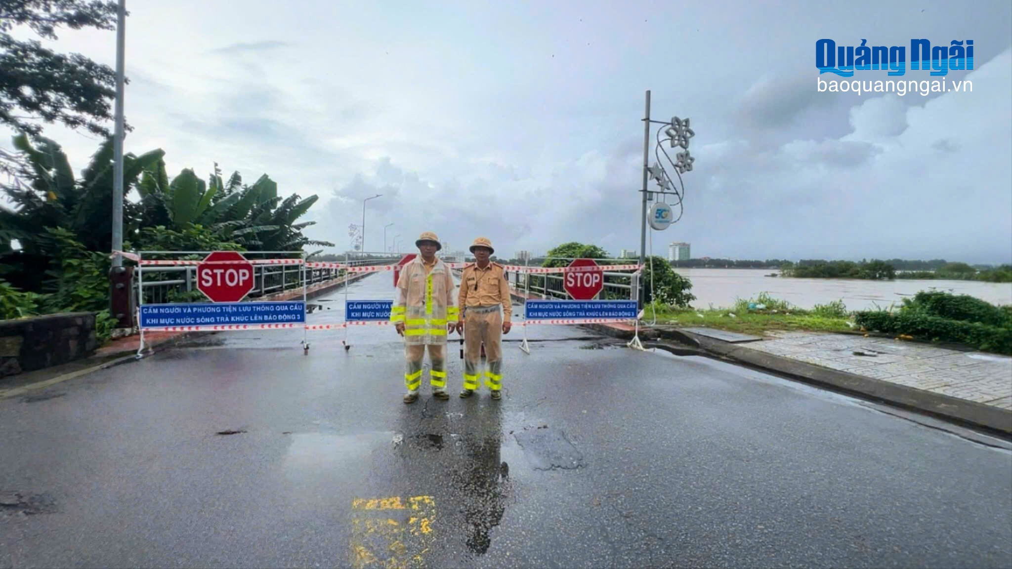 Lực lượng CSGT lập rào chắn, tạm thời cấm tất cả phương tiện và người dân qua cầu Trà Khúc 1 do mực nước sông dâng cao vượt báo động 3. Ảnh: CTV