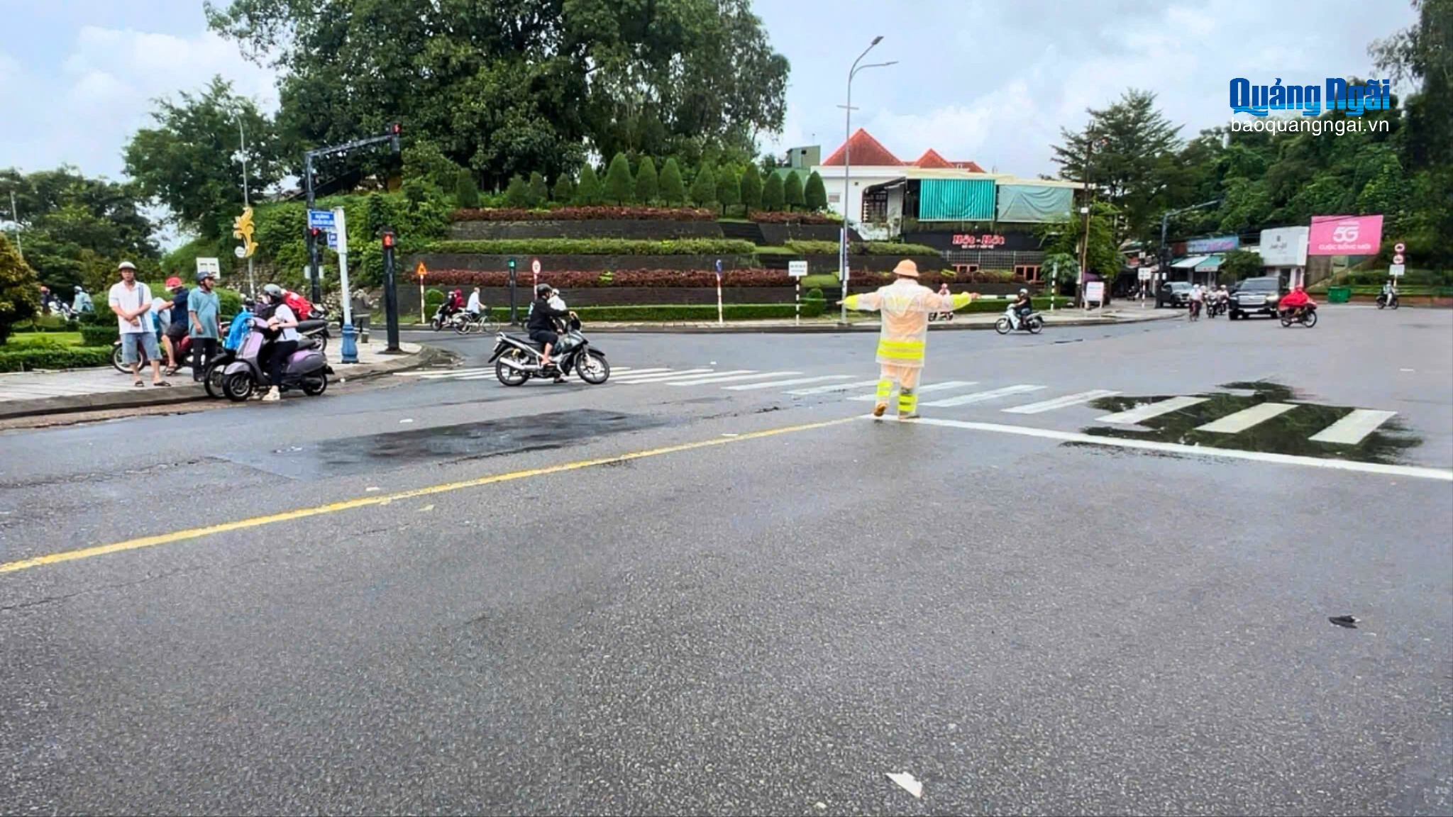 Cảnh sát giao thông phân luồng, hướng dẫn người dân di chuyển qua các tuyến thay thế để đảm bảo an toàn trong mưa lũ. Ảnh: CTV