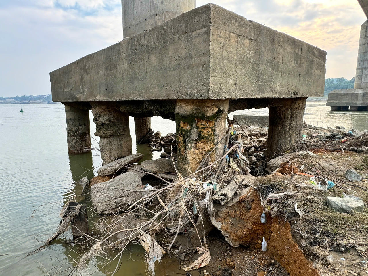 Theo ghi nhận của phóng viên, tại thời điểm ngày 28 và 29/10, mực nước sông qua khu vực cầu hạ thấp, để lộ rõ hàng loạt móng cọc khoan nhồi dưới các đế móng của cầu . Đáng chú ý, phần bê tông cọc chịu lực dưới trụ T3 bị xói mòn, khoét sâu khoảng 2 mét, khiến một số cọc móng lộ cốt thép rỉ sét, một trong số đó gần như mất hoàn toàn lớp bê tông bảo vệ cốt thép.