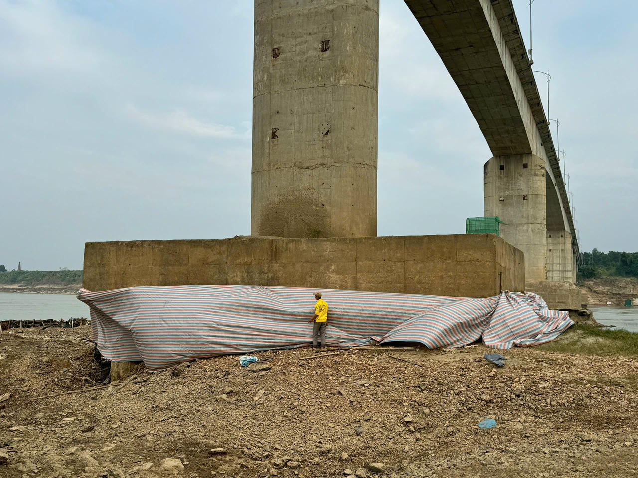 Đơn vị quản lý đường bộ đã cho quây bạt quanh đế móng trụ cầu T3, Cầu Sông Lô. Ảnh: Ngọc Phúc
