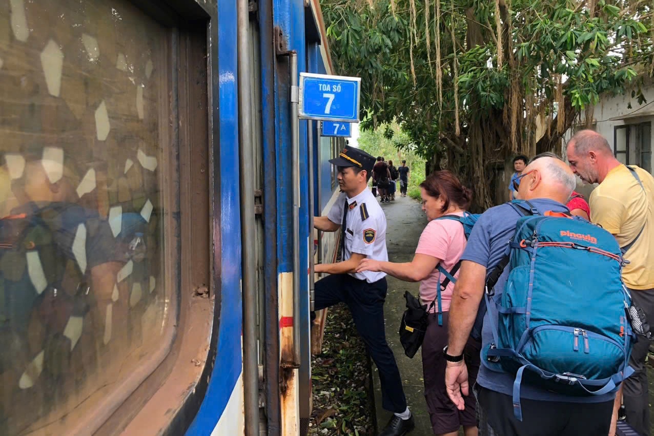 Nhân viên đường sắt hỗ trợ khách nước ngoài lên tàu, ngày 30/9. Ảnh: Đơn vị cung cấp.