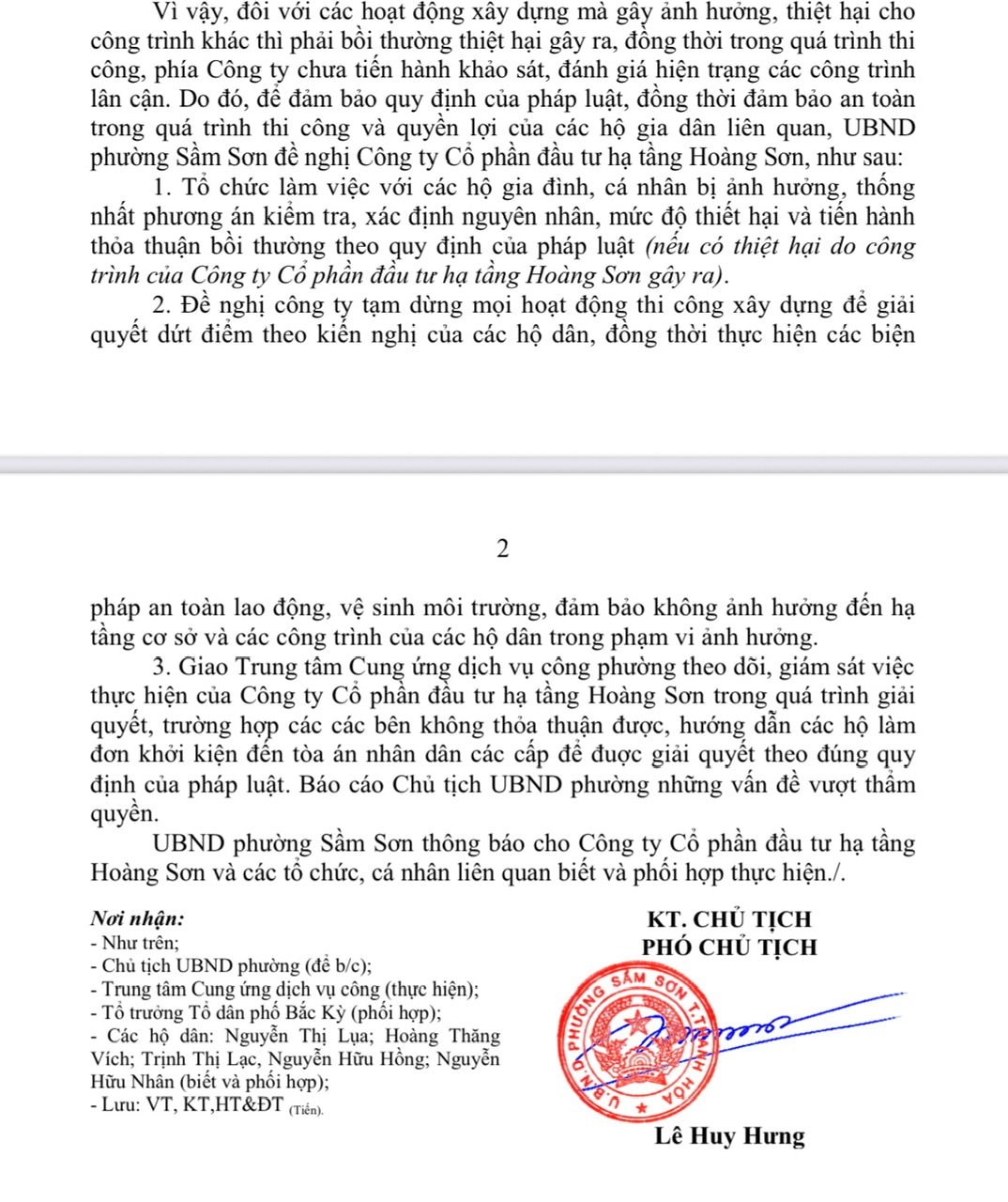 "Yêu cầu công ty tạm dừng mọi hoạt động thi công xây dựng để giải quyết dứt điểm theo kiến nghị của các hộ dân, đồng thời thực hiện các biện pháp an toàn lao động, vệ sinh môi trường, đảm bảo không ảnh hưởng đến hạ tầng cơ sở và các công trình của các hộ dân trong phạm vi ảnh hưởng", văn bản nêu.