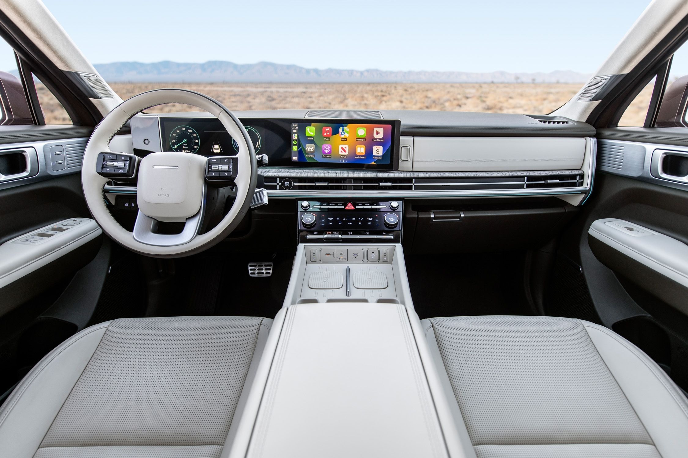 Hyundai Santa Fe thế hệ mới gây ấn tượng với thiết kế nội thất đồng nhất với ngoại thất, nổi bật với những đường nét vuông vức. Khu vực táp-lô được bố trí theo phương ngang, trang bị cặp màn hình có độ phân giải cao, bao gồm cụm đồng hồ đo kỹ thuật số và màn hình thông tin giải trí cảm ứng kích thước 12,3 inch.