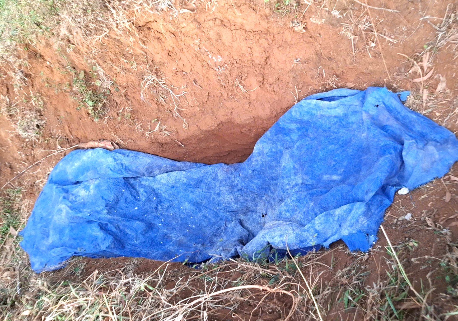 Vị trí hố chôn chiếc xe mô tô được các đối tượng phủ bạt cất giữ.