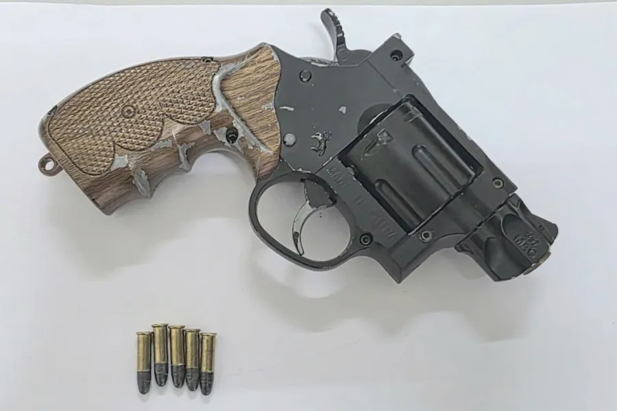 Tang vật chiếc súng và 5 viên đạn công an thu giữ.