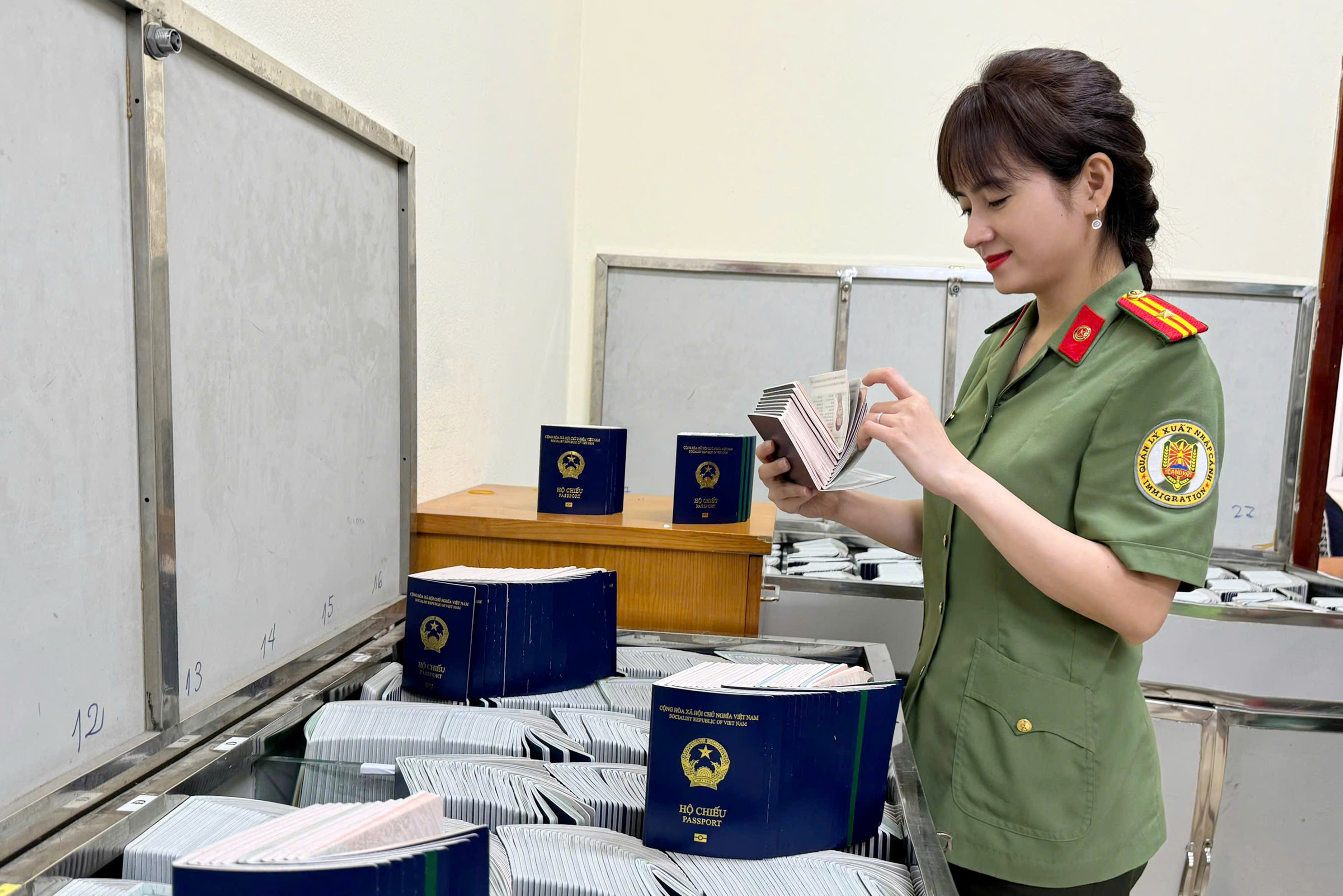 Thiếu tá Phạm Thị Hạnh vui mừng khi thấy tấm hộ chiếu mang tên Trần Thị Mùi đã có tại đơn vị chỉ sau 24 giờ làm thủ tục (Hình ảnh ghi nhận sáng ngày 22/4 tại Phòng Quản lý xuất nhập cảnh CATP Hà Nội)