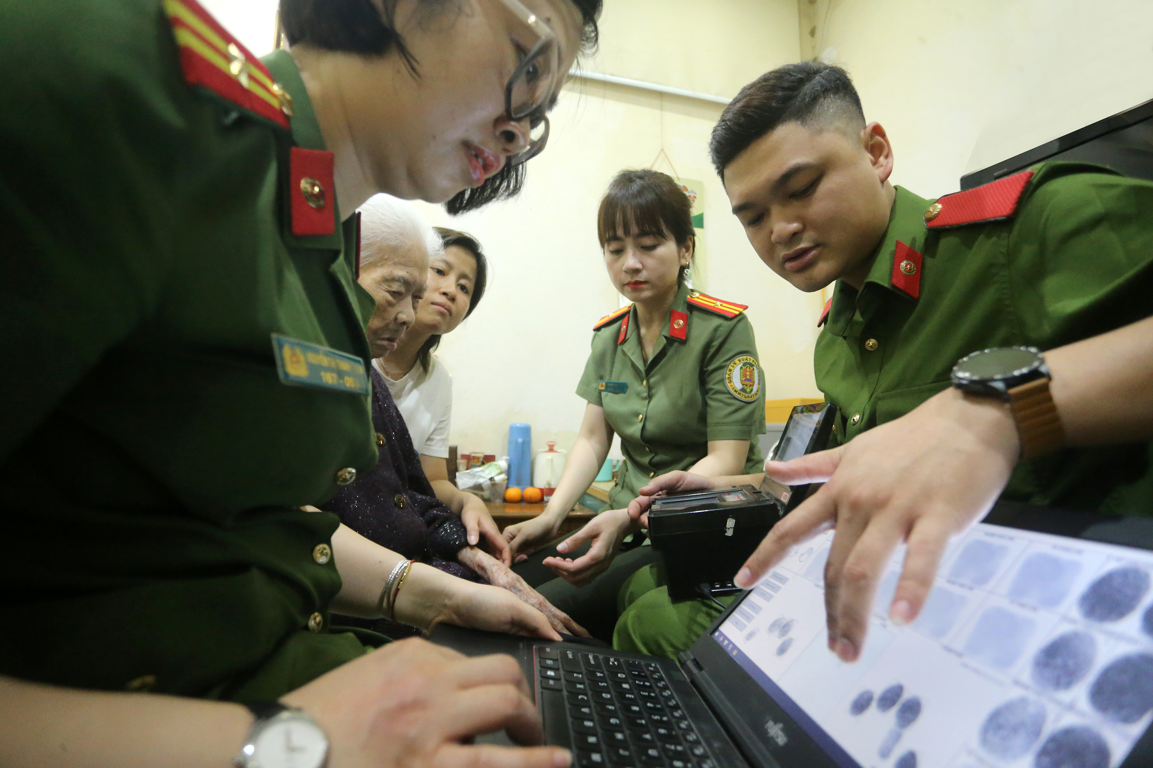 Khó khăn hơn cả vẫn là việc lấy vân tay, các chiến sĩ phải làm đi làm lại nhiều lần do nhiều đường vân bị mất, bị mờ...