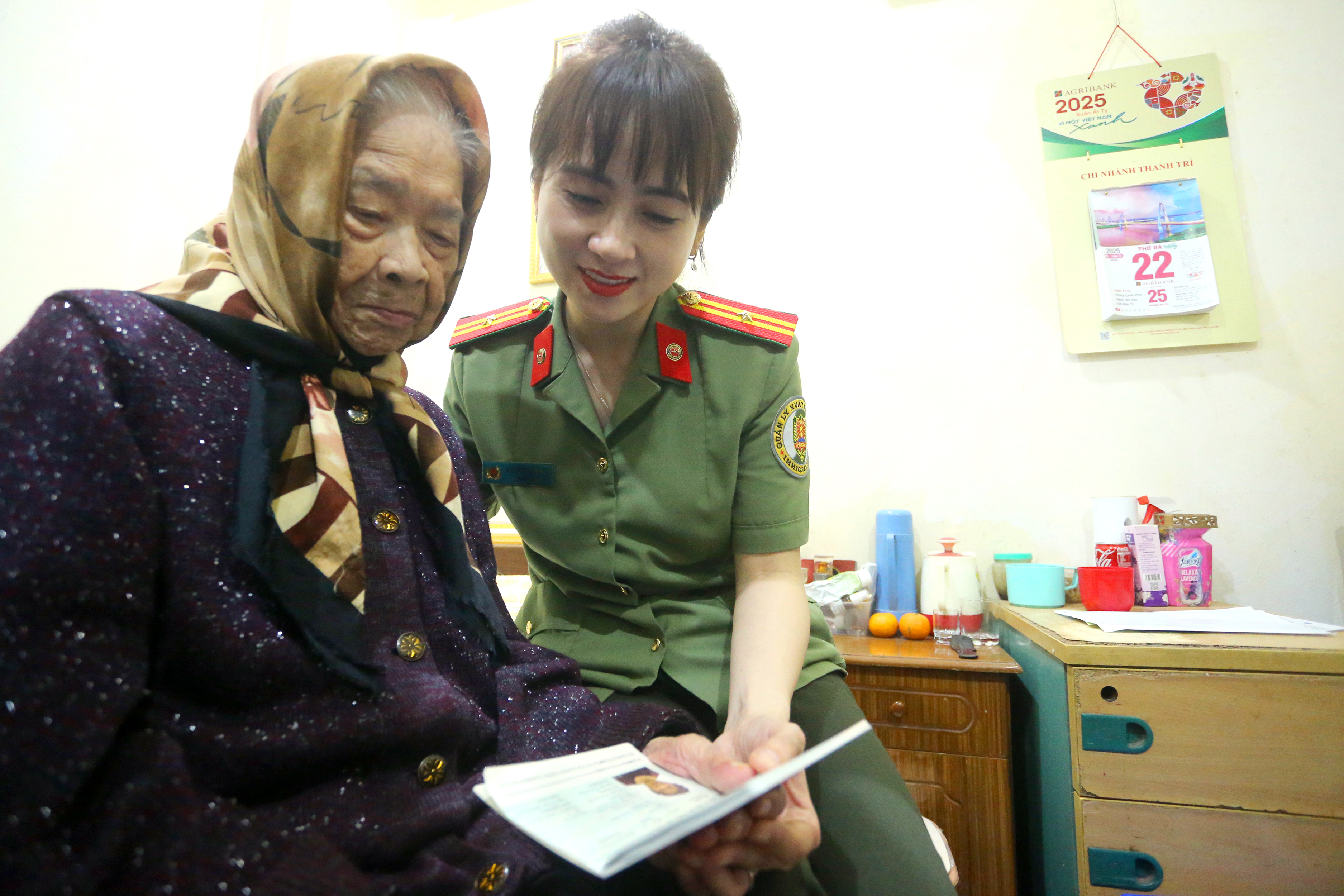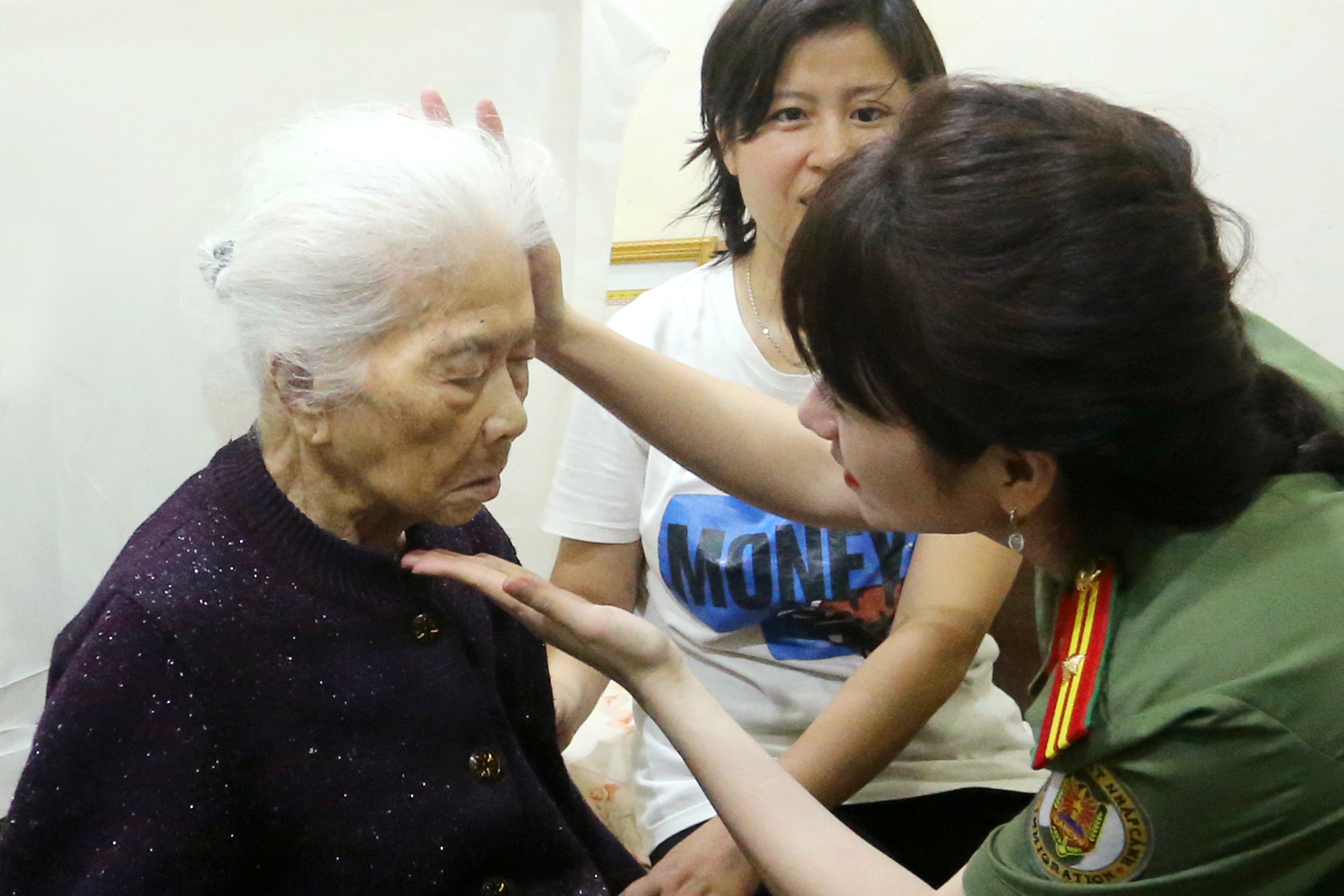 Thiếu tá Phạm Thị Hạnh vừa trò chuyện, vừa cẩn thận chỉnh lại mái tóc cho cụ để chuẩn bị chụp ảnh