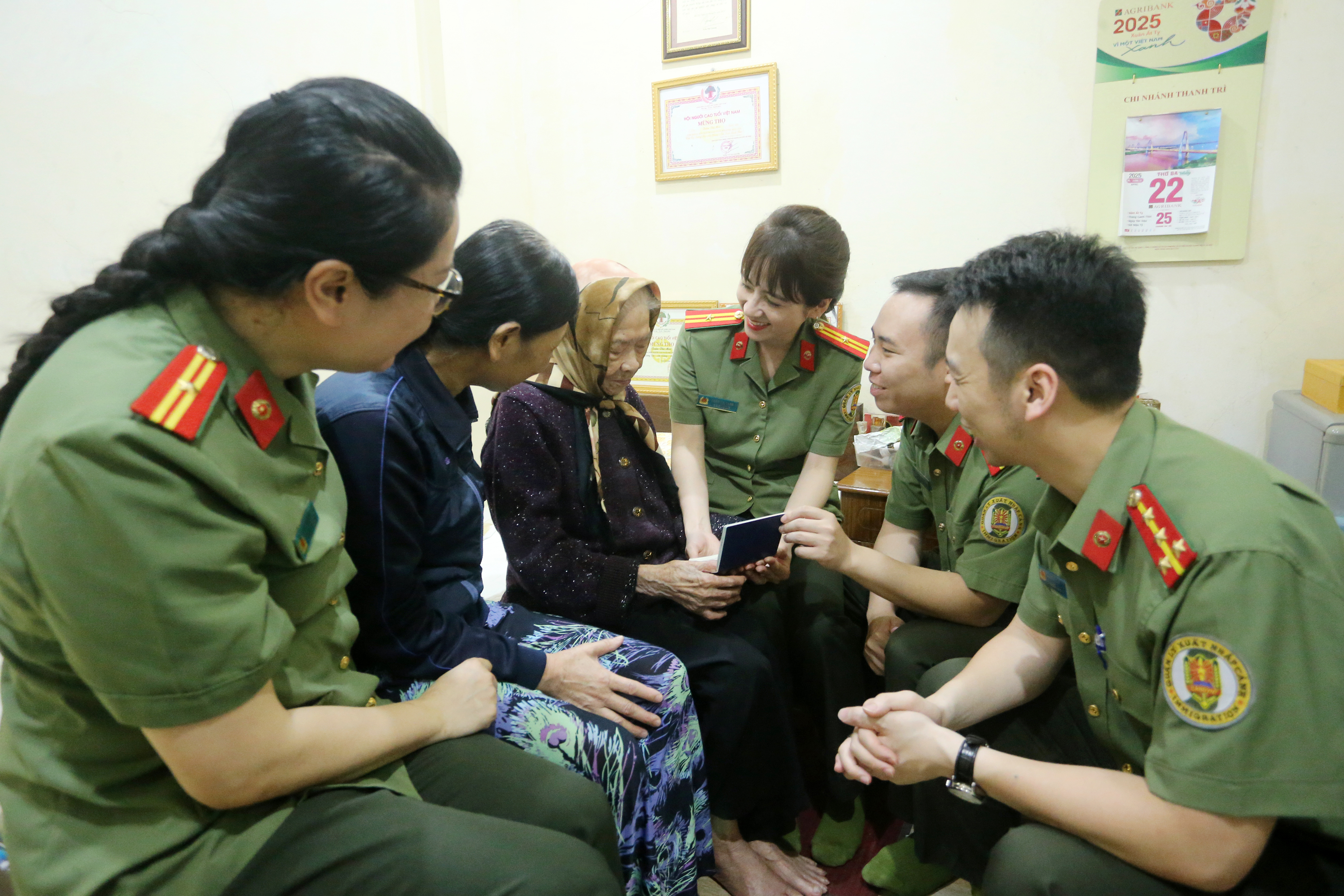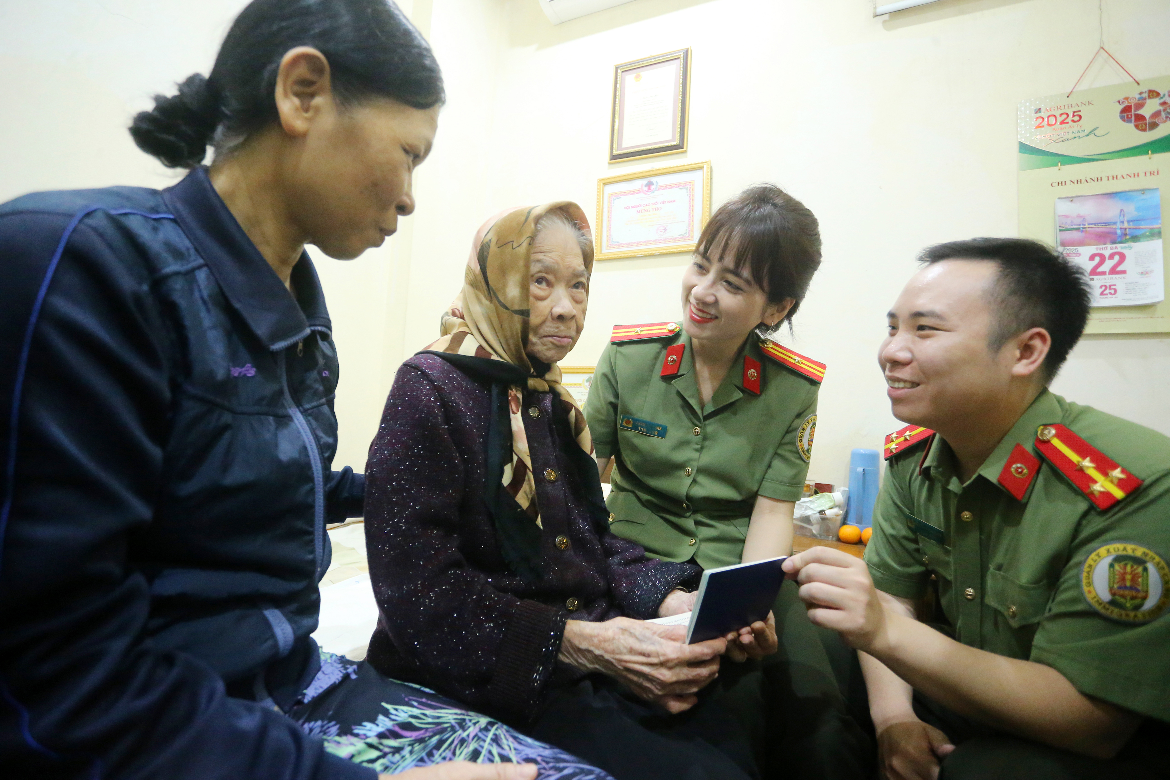Thiếu tá Phạm Thị Hạnh - Phòng Quản lý xuất nhập cảnh chia sẻ "Trước đó, bộ phận tiếp công dân của đơn vị có nhận được thông tin cũng như nguyện vọng của gia đình cụ Mùi muốn làm thủ tục cấp hộ chiếu để sang nước ngoài sống cùng con cháu. Tuy nhiên, vì tuổi sao, sức yếu nên cụ không thể đi lại, các chiến sĩ đã báo cáo với chỉ huy đơn vị để đến tận nhà để làm thủ tục hoàn thiện "tấm vé thông hành"