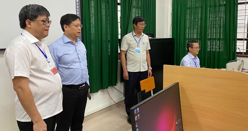 Phó Chủ tịch Thường trực UBND thành phố Nguyễn Thanh Bình (thứ 2, từ trái qua) kiểm tra công tác tổ chức thi sáng nay