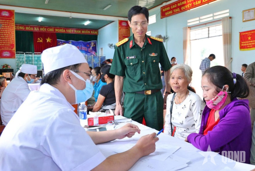 Đại tá, bác sĩ Hoàng Tiến Dũng theo dõi, kiểm tra công tác khám bệnh cho người dân tại chương trình phối hợp quân dân y, tháng 9-2025.