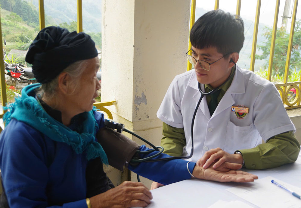 Tại một vị trí khác, Thượng tá Nguyễn Hồng Quang, Chủ nhiệm Khoa Cơ Xương Khớp-Nội tiết đang siêu âm cho người đàn ông chừng 60 tuổi. Bác sĩ Nguyễn Hồng Quang cho biết, bệnh nhân là ông Vàng Chẩn Sài, nhà ở thôn Xín Cái, xã Nghĩa Thuận. Ông Sài mắc bệnh phổi tắc nghẽn mãn tính khiến cơ thể mệt mỏi, ho, khó thở, đau tức ngực, hụt hơi ngay cả khi vận động nhẹ, nhất là vào thời điểm giao mùa, nếu điều trị không dứt điểm có thể gây ra một số biến chứng như suy hô hấp cấp. Ông Vàng Chẩn Sài được bác sĩ Quang chỉ định đi kiểm tra sức khỏe thường xuyên tại trung tâm y tế xã; liệu pháp oxy tại nhà, tập thở; nếu bệnh tiến triển nặng cần đến bệnh viện đa khoa tuyến trên để được điều trị kịp thời. Bác sĩ Nguyễn Hồng Quang chia sẻ: “Qua thăm khám, chúng tôi phát hiện bà con có rất nhiều mặt bệnh, nhưng phổ biến là các bệnh lý về cơ xương khớp, răng, hàm, mặt. Nam giới thường mắc các bệnh về gan do uống rượu, hút thuốc lá. Tùy từng trường hợp, chúng tôi tư vấn cho bà con phương pháp điều trị; đồng thời khuyên bà con cần chú ý chế độ ăn uống, tập thể dục, sinh hoạt hằng ngày, không lạm dụng rượu, bia”.