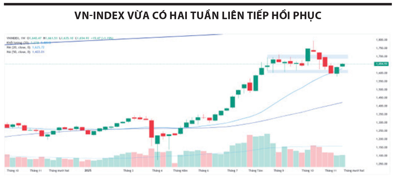 Đến cuối tuần, sự hỗ trợ trở lại của nhóm vốn hóa lớn giúp chỉ số bật hồi, qua đó ghi nhận tuần tăng thứ hai liên tiếp kể từ vùng đáy 1.580 điểm. Kết tuần, VN-Index tăng hơn 19 điểm (tăng 1,19%) và đóng cửa sát 1.655 điểm.