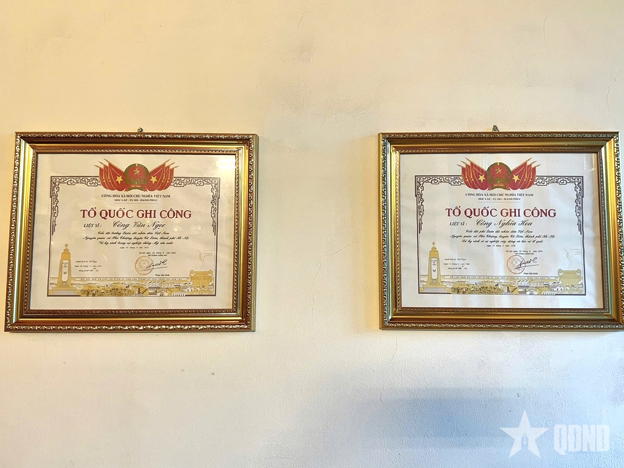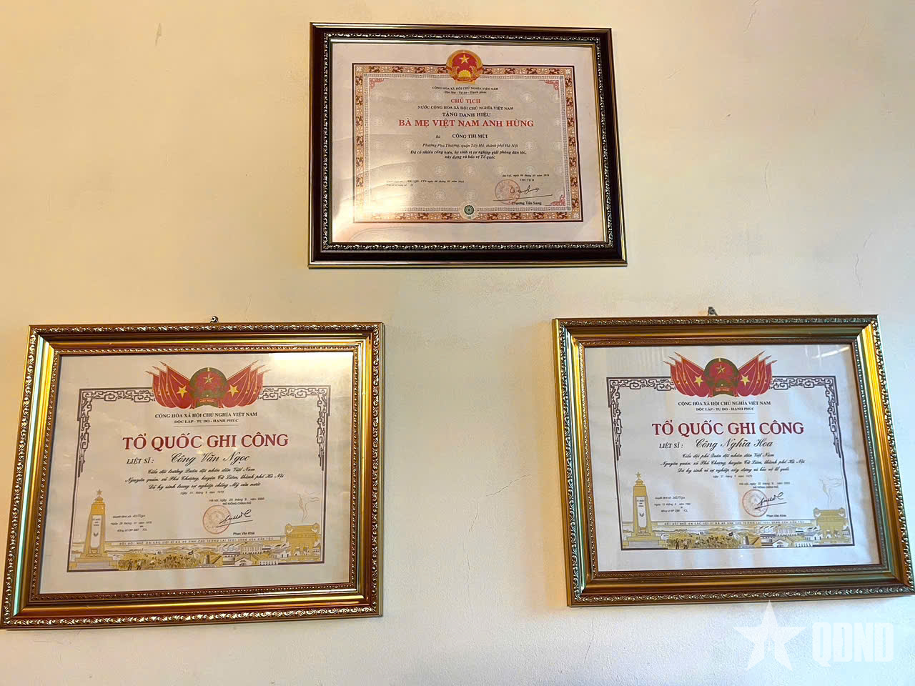 Tấm bằng Danh hiệu Bà mẹ Việt Nam anh hùng Công Thị Mùi cùng Bằng Tổ quốc ghi công hai liệt sĩ Công Văn Ngọc và Công Nghĩa Hoa được treo trang trọng trên tường.