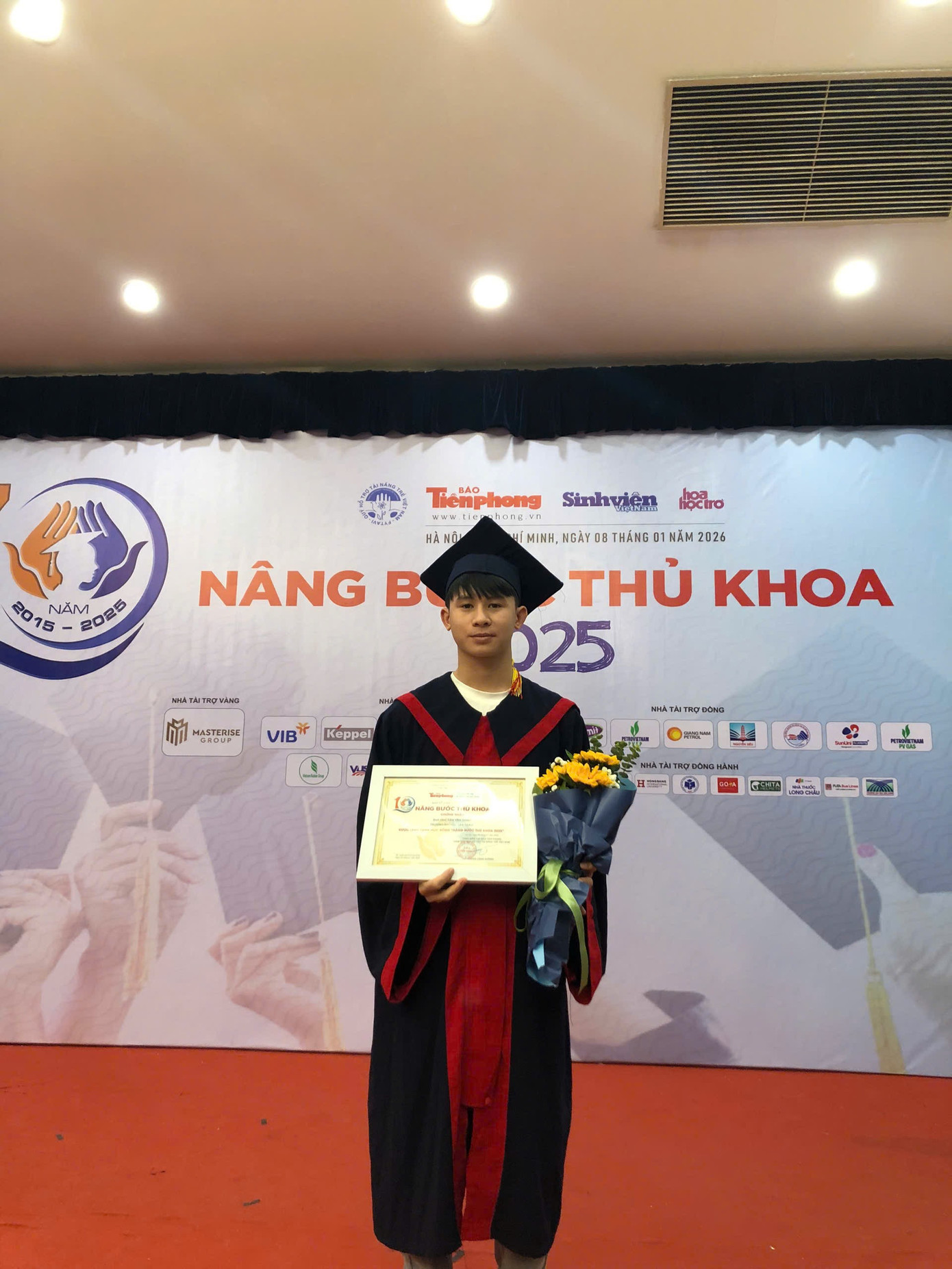 Sần Văn Thinh nhận học bổng “Nâng nước Thủ khoa 2025” của Báo Tiền Phong.