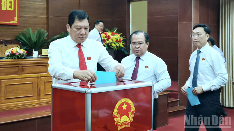 Các đại biểu Hội đồng nhân dân tỉnh Cà Mau bỏ phiếu bầu Chủ tịch Ủy ban nhân dân tỉnh Cà Mau tại kỳ họp thứ 5.