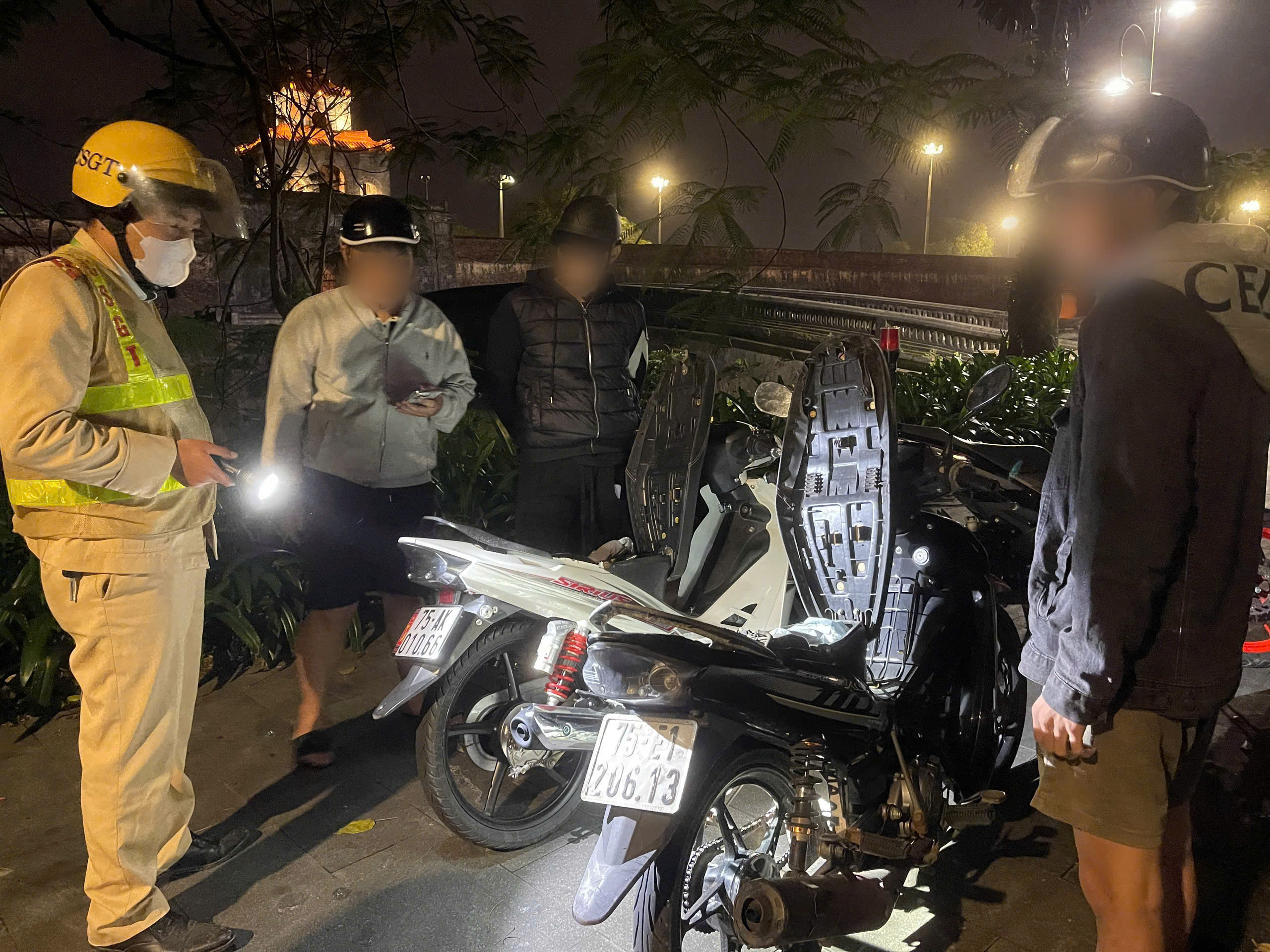 Theo ghi nhận tại các tuyến đường trung tâm TP Huế, lực lượng 1311 duy trì tuần tra liên tục. Mỗi đêm, các tổ công tác phát hiện và lập biên bản 15 đến 20 trường hợp vi phạm, chủ yếu là không đội mũ bảo hiểm, xe không gắn biển số, không có giấy phép lái xe, vi phạm nồng độ cồn.
