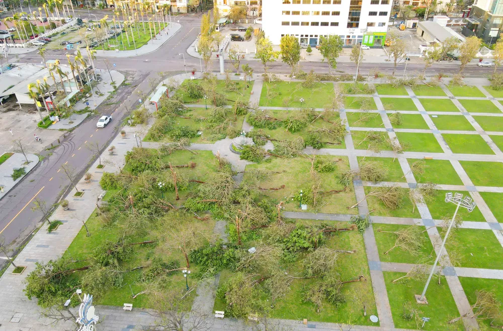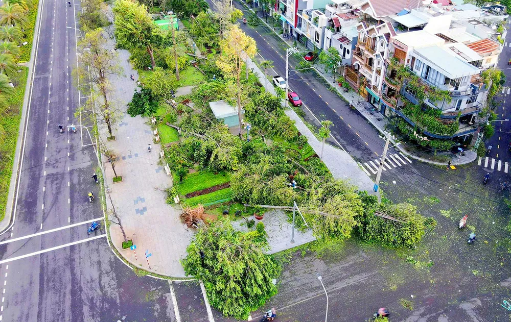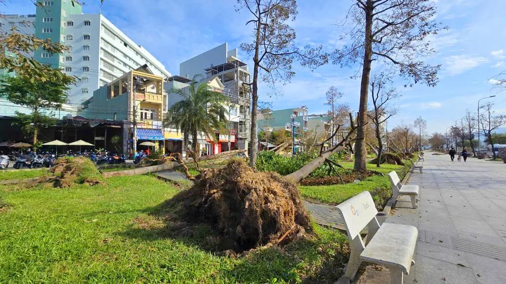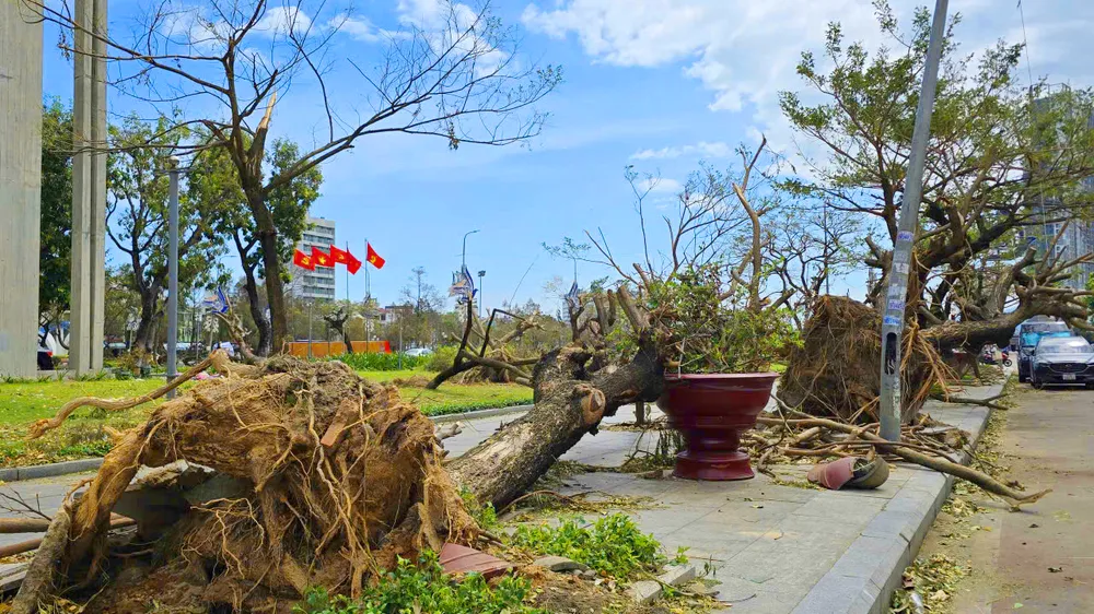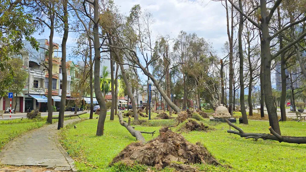 Mảng cây xanh tại khu vực quảng trường Nguyễn Tất Thành bị bão số 13 đánh quật ngã gần hết.