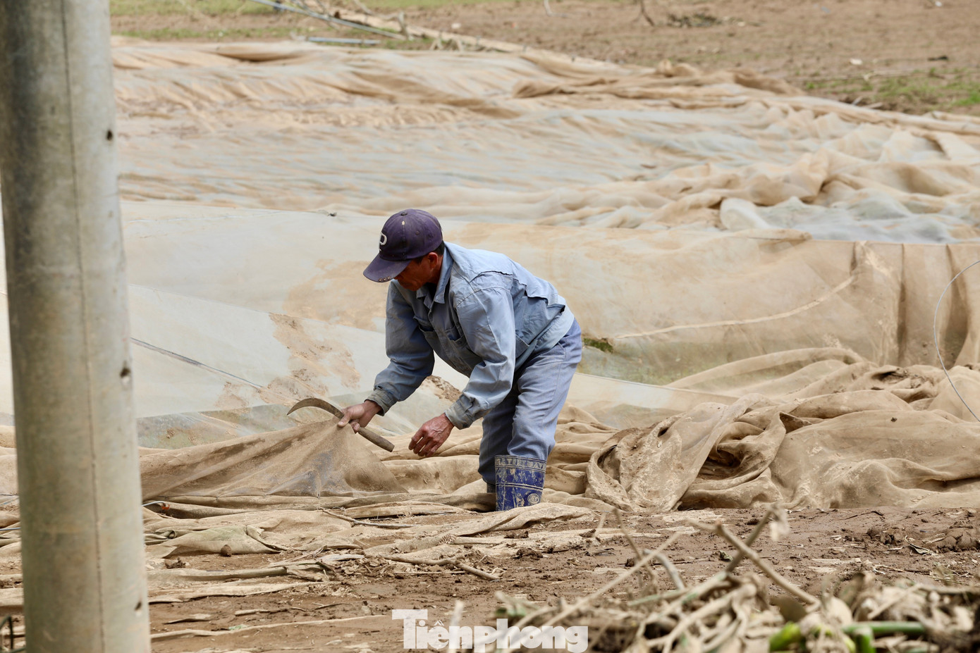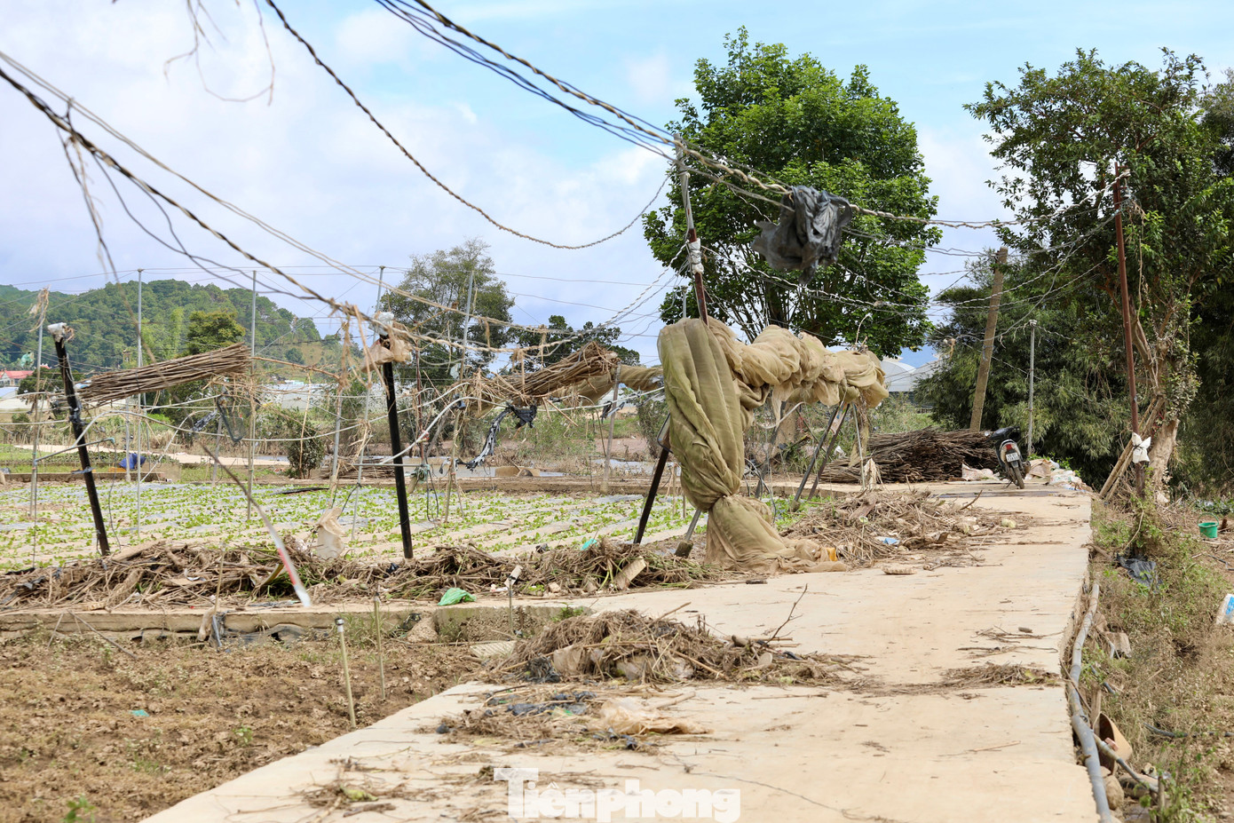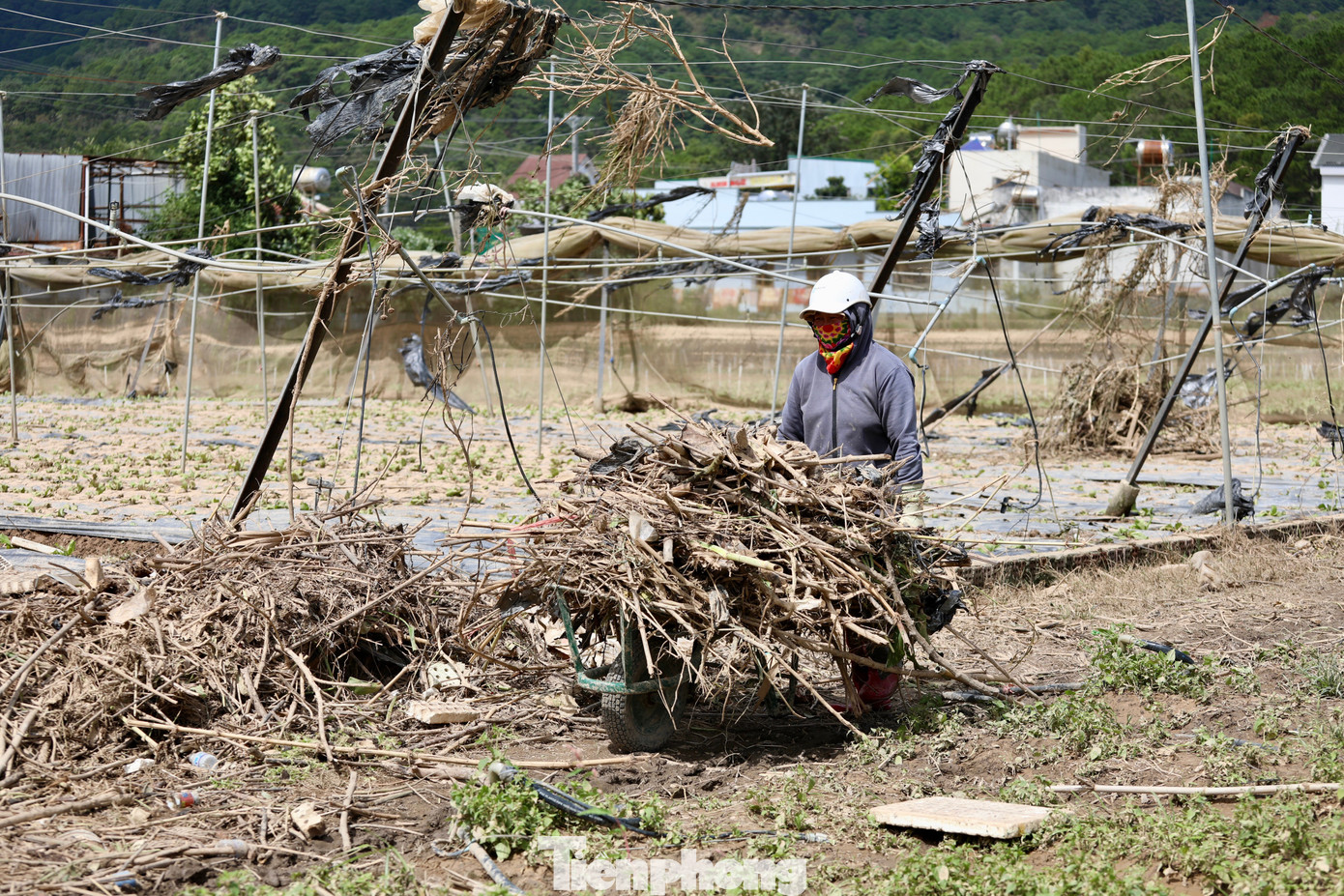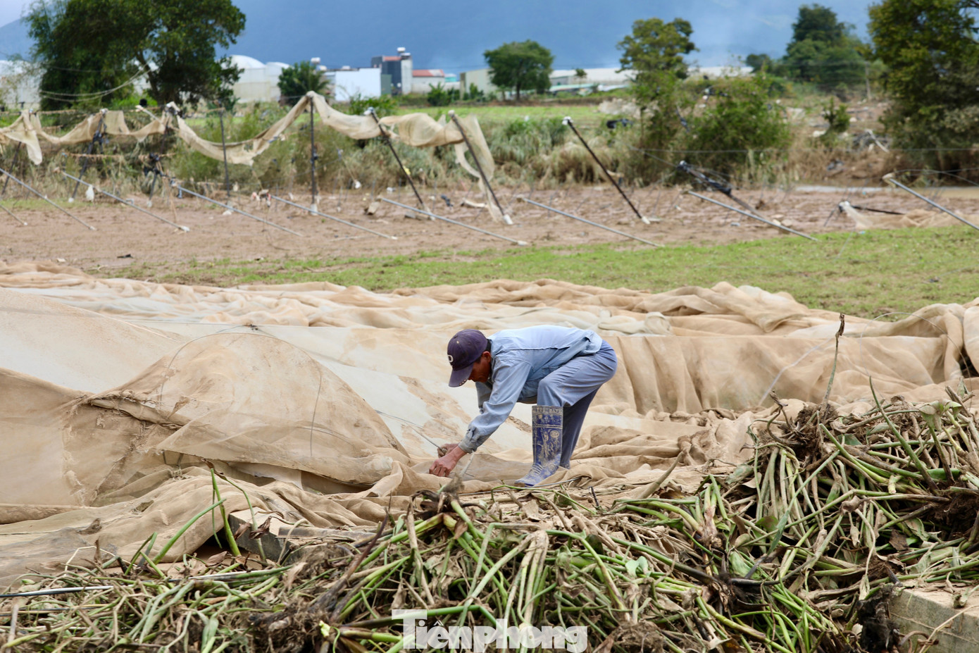 Ông Lê Văn Thắng vừa dọn lưới vườn rau tan hoang vừa nghẹn ngào: "Nhà kính 3,5 sào bị lũ cuốn trôi, ước tính mất khoảng 200 triệu đồng, còn hoa màu thì chưa biết tính sao… nhìn vườn tan tác mà lòng tôi nặng trĩu".