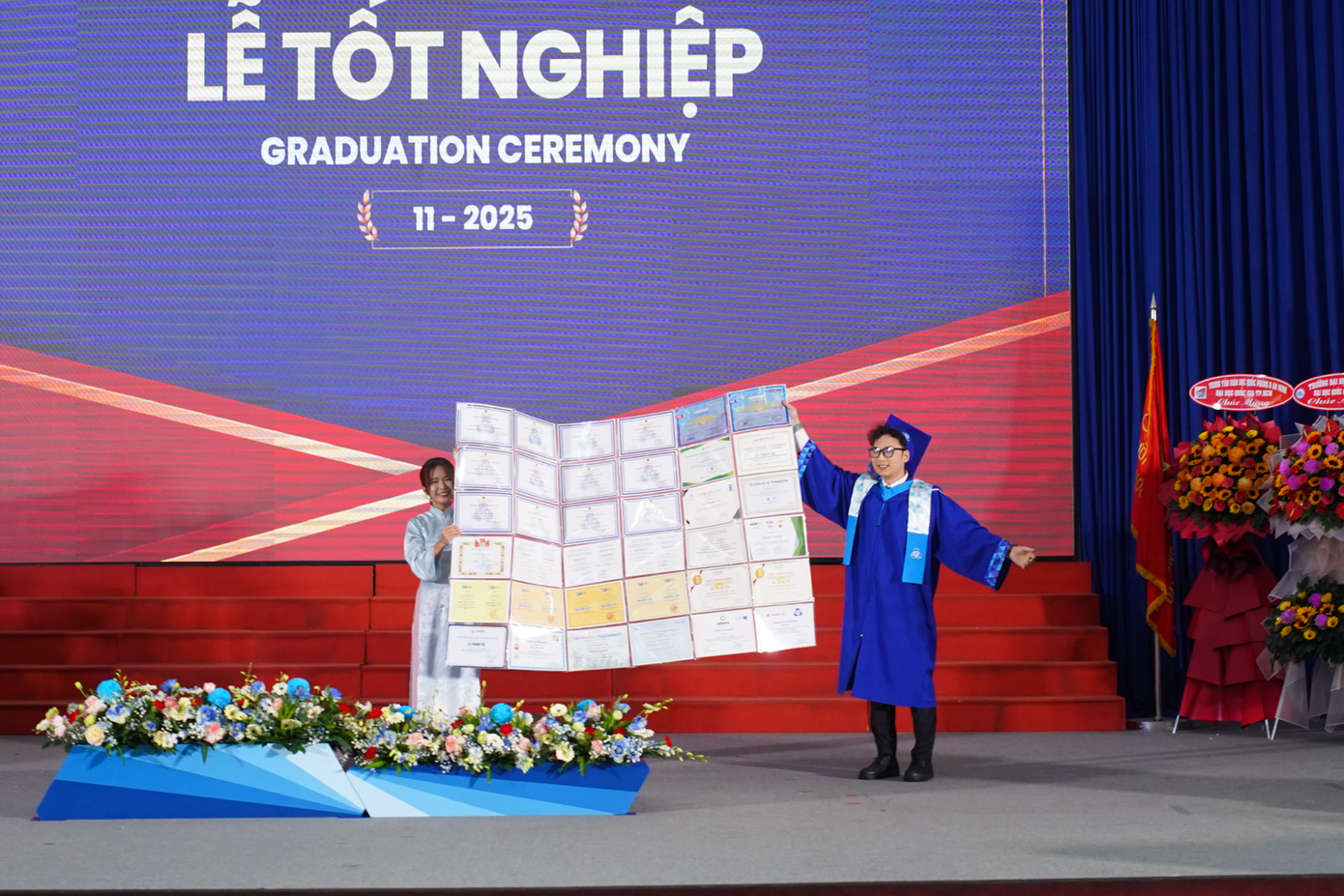 Hình ảnh chàng kỹ sư trẻ ôm những tấm giấy khen mỉm cười rạng rỡ giữa tiếng vỗ tay trở thành dấu ấn đặc biệt của buổi lễ.