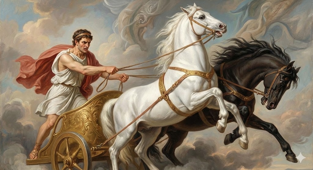 Thần Apollo (Lý trí) đang nỗ lực điều khiển hai con ngựa: một con trắng ngoan ngoãn (ý chí thanh cao) và một con đen bất kham (bản năng, dục vọng), tượng trưng cho sự giằng xé bên trong mỗi con người như hình tượng nhân mã.