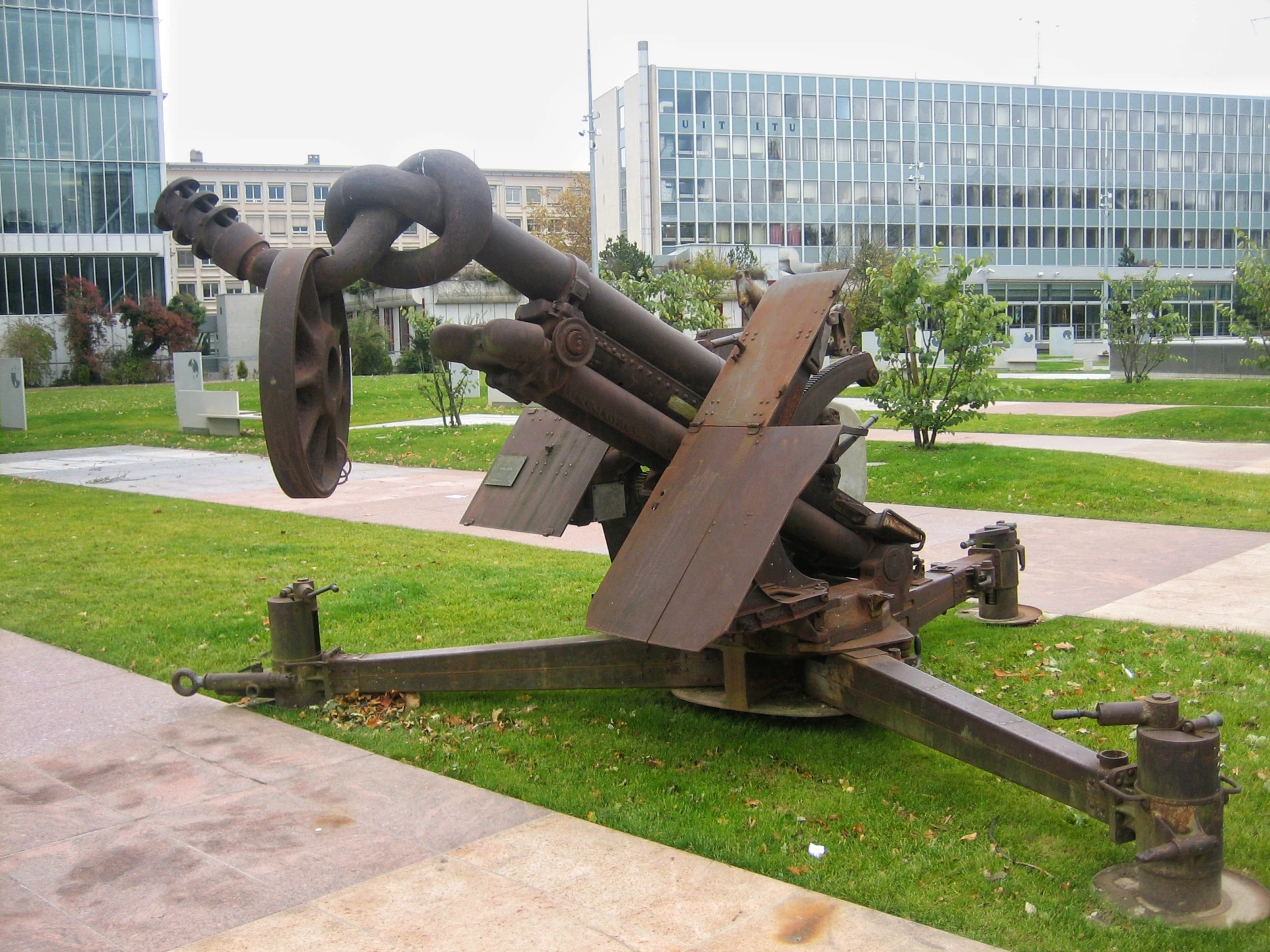 Khi tôi mở rộng phạm vi tham quan trong không gian tượng đài, thì phát hiện ở đây còn có một “kiến trúc” độc đáo khác, đặt đối diện với tượng đài Chiếc ghế gãy: Cỗ đại bác bị buộc nòng lại! Nếu có mối liên hệ thực sự nào giữa Chiếc ghế gãy và cỗ đại bác bị vô hiệu hóa này thì tượng đài Chiếc ghế gãy ở Genève được gia tăng nội hàm từ phản đối bom mìn đến phản đối chiến tranh!