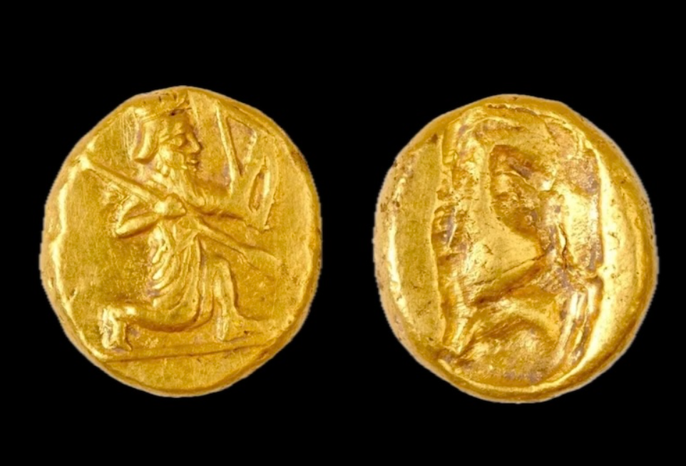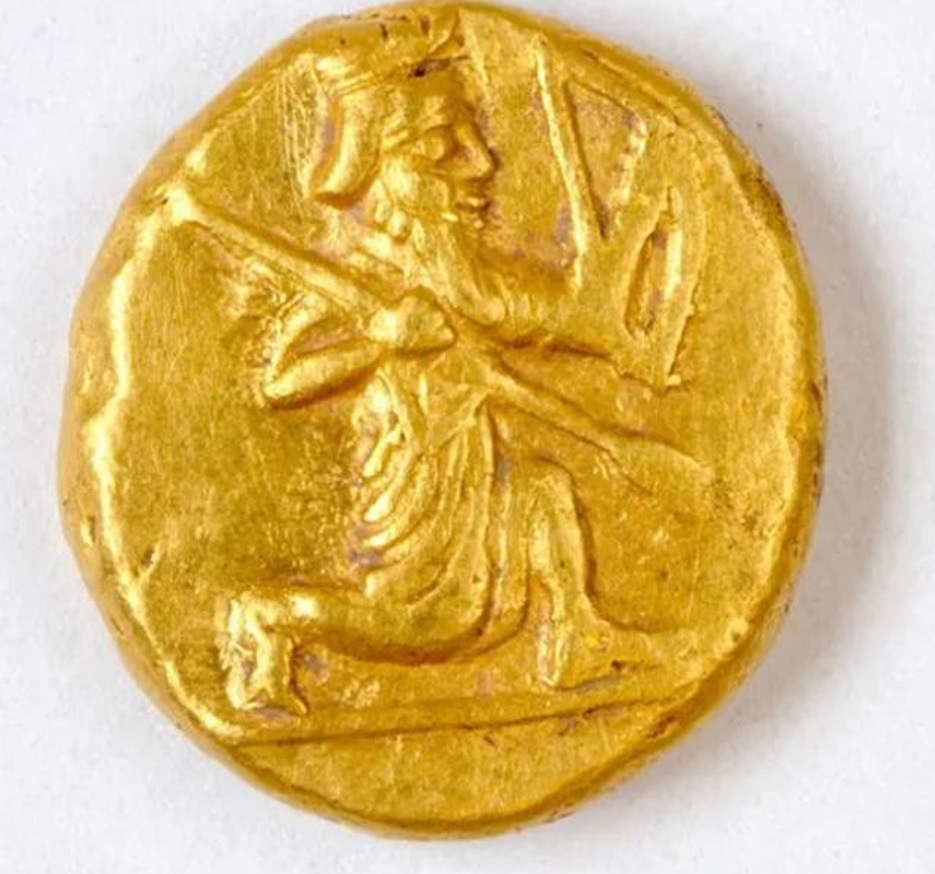 Trên đồng tiền vàng này có khắc hình một cung thủ đang quỳ gối đặc thù, kỳ lạ. Ảnh: @Bảo tàng Khảo cổ học Ephesus.