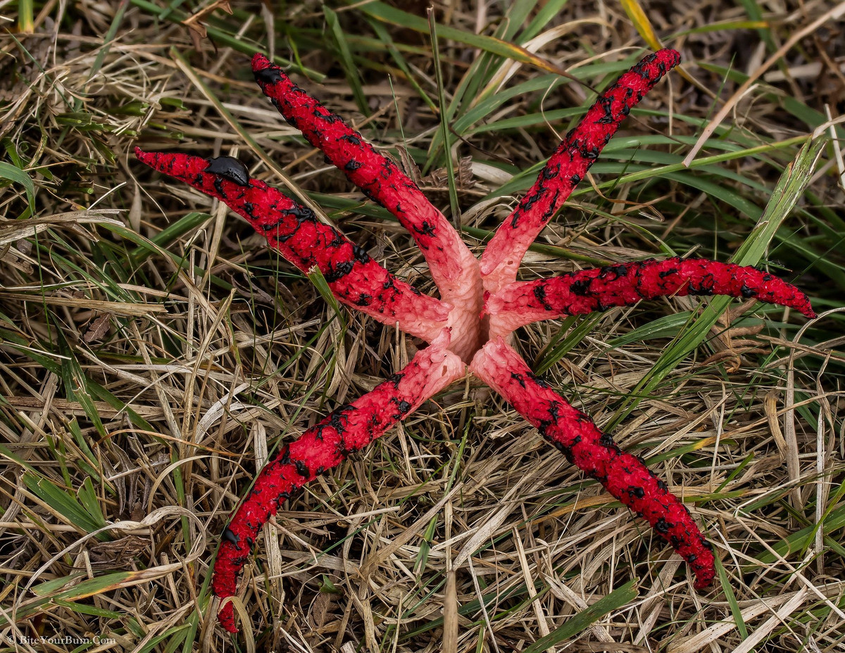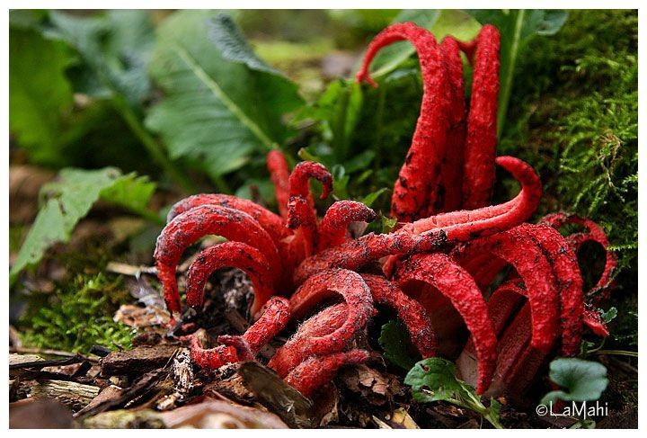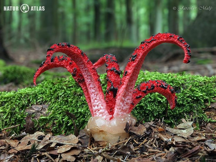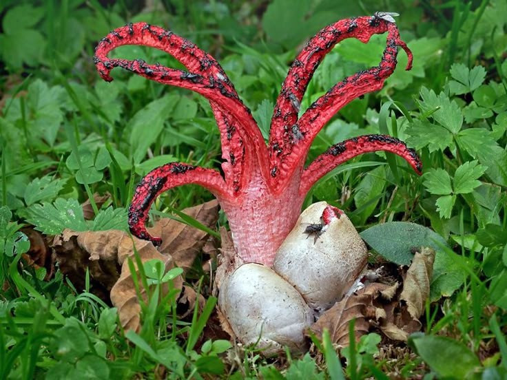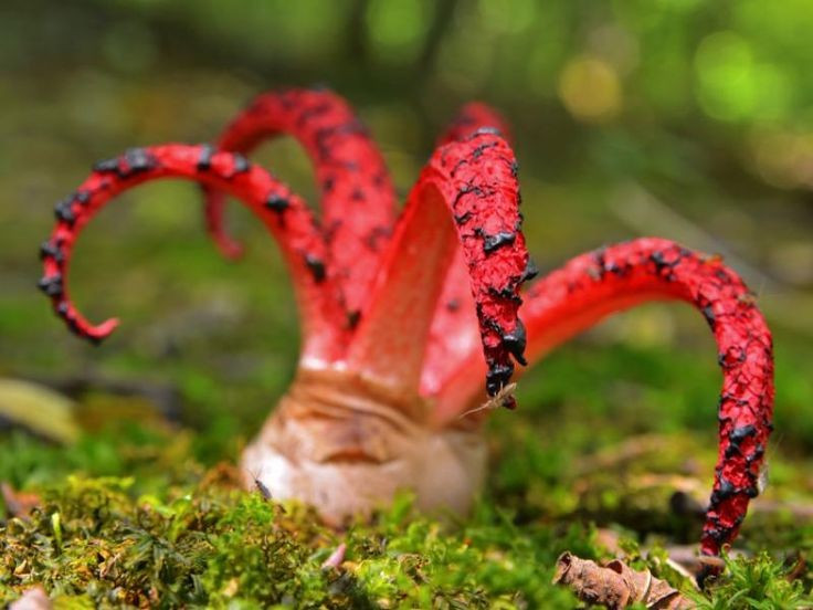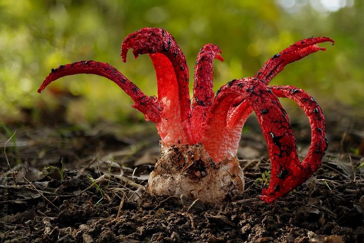 Hình dạng như xúc tu quái vật. Khi trưởng thành, nấm mở ra bốn đến tám “ngón” đỏ tươi, trông như bàn tay máu, vươn lên từ mặt đất. Ảnh: Pinterest.