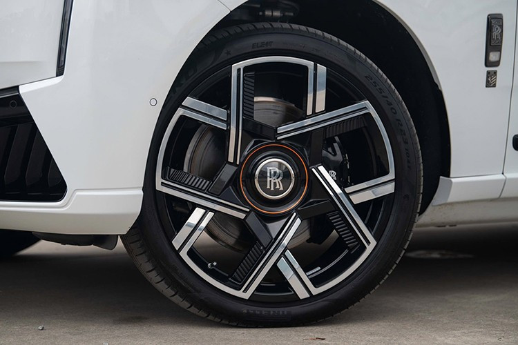 Điểm nhấn ở hông xe là đường coachline màu cam Mandarin được vẽ thủ công bởi nghệ nhân. Tay nắm cửa, logo và nẹp ốp hông đều sơn tối màu. Bộ mâm trên phiên bản Series II có kích thước 23 inch với hai tông màu đen-bạc. Thiết kế mâm tạo hình cánh hoa độc quyền trên bản Black Badge, bên cạnh cùm phanh màu đen tùy chọn.