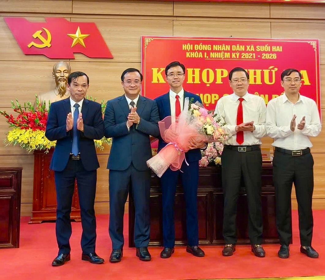 Lãnh đạo xã Suối Hai tặng hoa chúc mừng Phó Chủ tịch UBND xã Suối Hai nhiệm kỳ 2021-2026 Đỗ Văn Công. Ảnh: Khuất Duyên