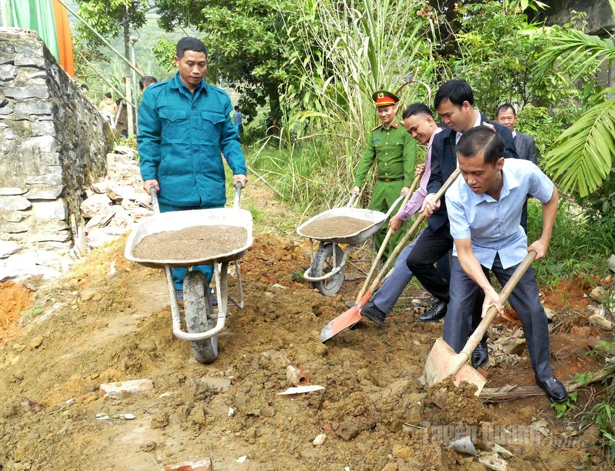 Cán bộ UBKT Tỉnh ủy, cán bộ xã và lực lượng 4 tại chỗ địa phương hỗ trợ gia đình san nền, dọn mặt bằng để khởi công xây dựng nhà ở.
