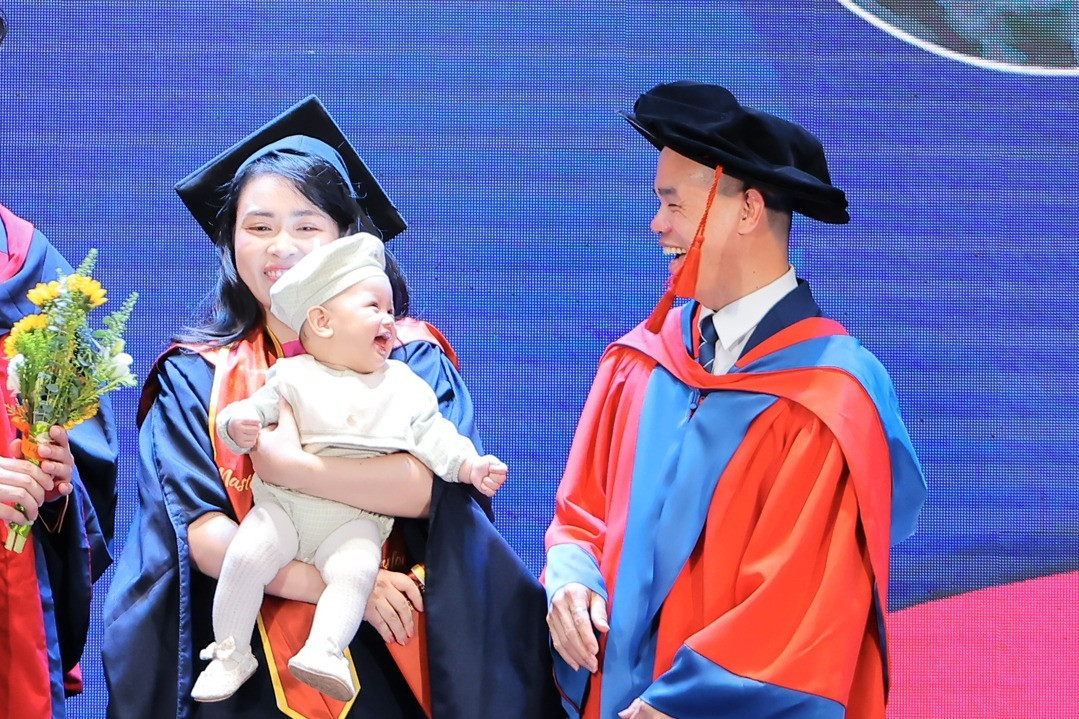 Sự xuất hiện của cô con gái nhỏ - người đã đồng hành cùng chị trong quá trình học thạc sĩ, tạo ra khoảnh khắc nhận tấm bằng tốt nghiệp trở nên đặc biệt và trọn vẹn hơn.
