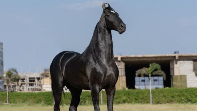 Với chiều cao 1,6 mét, Shahbaz được chăm sóc 24/7 bởi một huấn luyện tận tâm. Thức ăn hàng tháng của chú ngựa đen có giá khoảng 50.000 Rupee, bao gồm hỗn hợp ngũ cốc, trái cây khô và các chất bổ sung. Ảnh: The Indian Express
