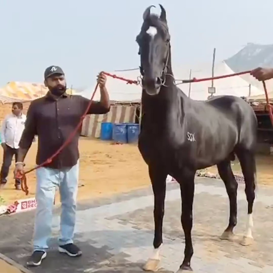 Tại Hội chợ gia súc quốc tế Pushkar đang diễn ra ở Ajmer, Rajasthan (Ấn Độ), một chú ngựa giống Marwari có tên Shahbaz, trở thành tâm điểm chú ý của khách tham quan. Ảnh: Indianexpress