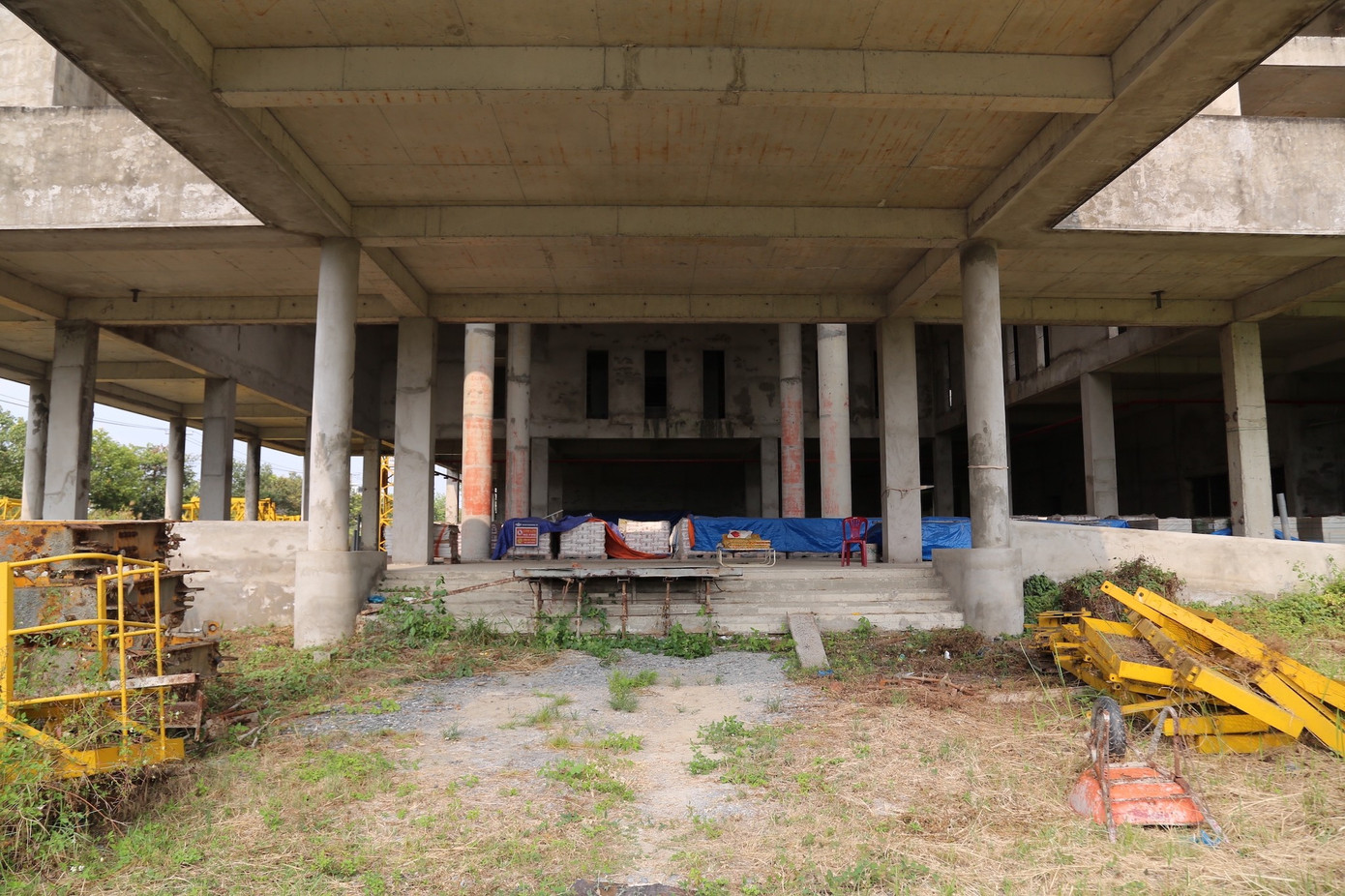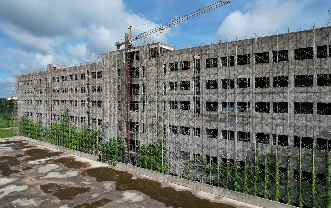 Thanh tra Chính phủ xác định, trong quá trình triển khai, liên danh nhà thầu không đảm bảo tỷ lệ hàng hóa Hungary (phải trên 50%). Khi dự án dừng thi công, chỉ có 1/123 thiết bị đạt xuất xứ Hungary (0,78%). Trách nhiệm việc này được xác định thuộc Liên danh nhà thầu (cung cấp thông tin sai lệch) và Sở Y tế Cần Thơ (chủ đầu tư), khi đã báo cáo sai tỷ lệ 50,07% hàng hóa Hungary. Ảnh: Nhiều hạng mục bệnh viện mới hoàn thành phần móng và khung bê tông, nay cỏ mọc um tùm.