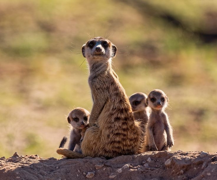 Chúng dạy con non cách sinh tồn. Cầy vằn trưởng thành sẽ hướng dẫn con non săn mồi và trốn nguy hiểm, giống một lớp học thực thụ ngoài thiên nhiên. Ảnh: Pinterest.