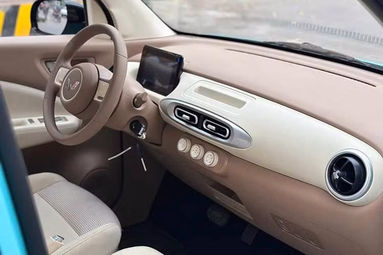 Không chỉ rộng hơn, nội thất của Wuling Macaron còn được nâng cấp về mặt thiết kế và trang bị so với Hongguang Mini EV cũ. Mặt táp-lô, cửa gió và các núm xoay chỉnh điều hòa của xe đều đã được làm mới. Trên mặt táp-lô, xe được trang bị vô lăng 2 chấu hình tròn, tích hợp một số phím chức năng.