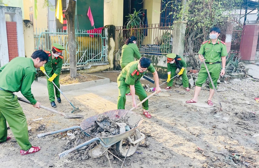 Mưa đã tạnh, nước đã rút, nhưng dấu tích của trận lũ vẫn còn trên từng bức tường, từng con đường lấm bùn. Ngay sau khi thiên tai qua đi, cán bộ, chiến sĩ Công an phường Phú Xuân tiếp tục xuống từng khu dân cư, giúp người dân dọn dẹp nhà cửa, vệ sinh môi trường, hỗ trợ sửa chữa hệ thống điện, nước, trường học. Các anh cùng bà con kéo từng bao rác, xúc từng lớp bùn, hỗ trợ lương thực, nước uống cho các hộ khó khăn, động viên người dân sớm trở lại cuộc sống bình thường.