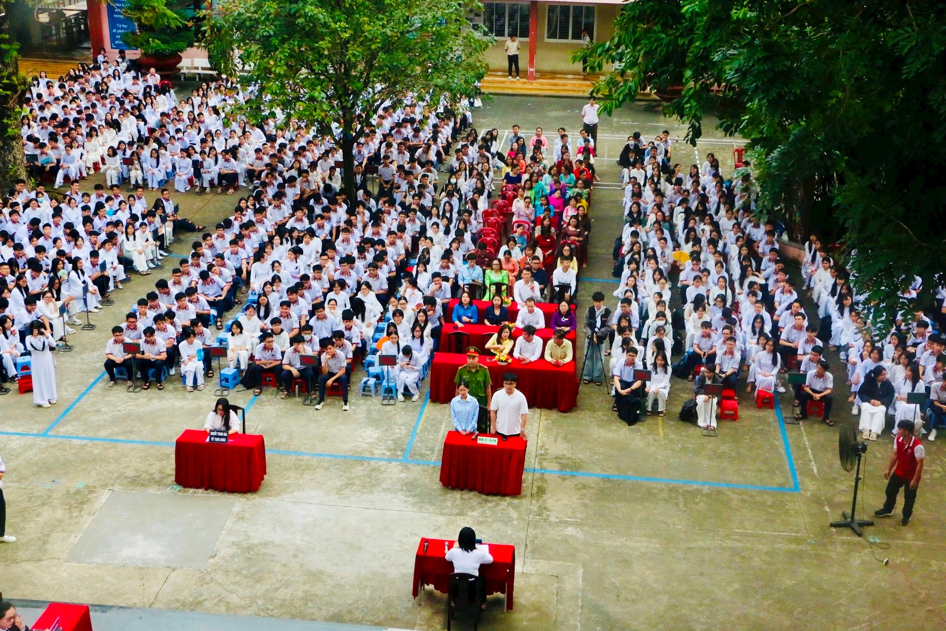 Phiên tòa giả định có sự tham dự của toàn thể hơn 2.000 em học sinh các khối 10, 11, 12, Ban Giám hiệu, giáo viên chủ nhiệm, Tổ Giáo dục Kinh tế và Pháp luật…