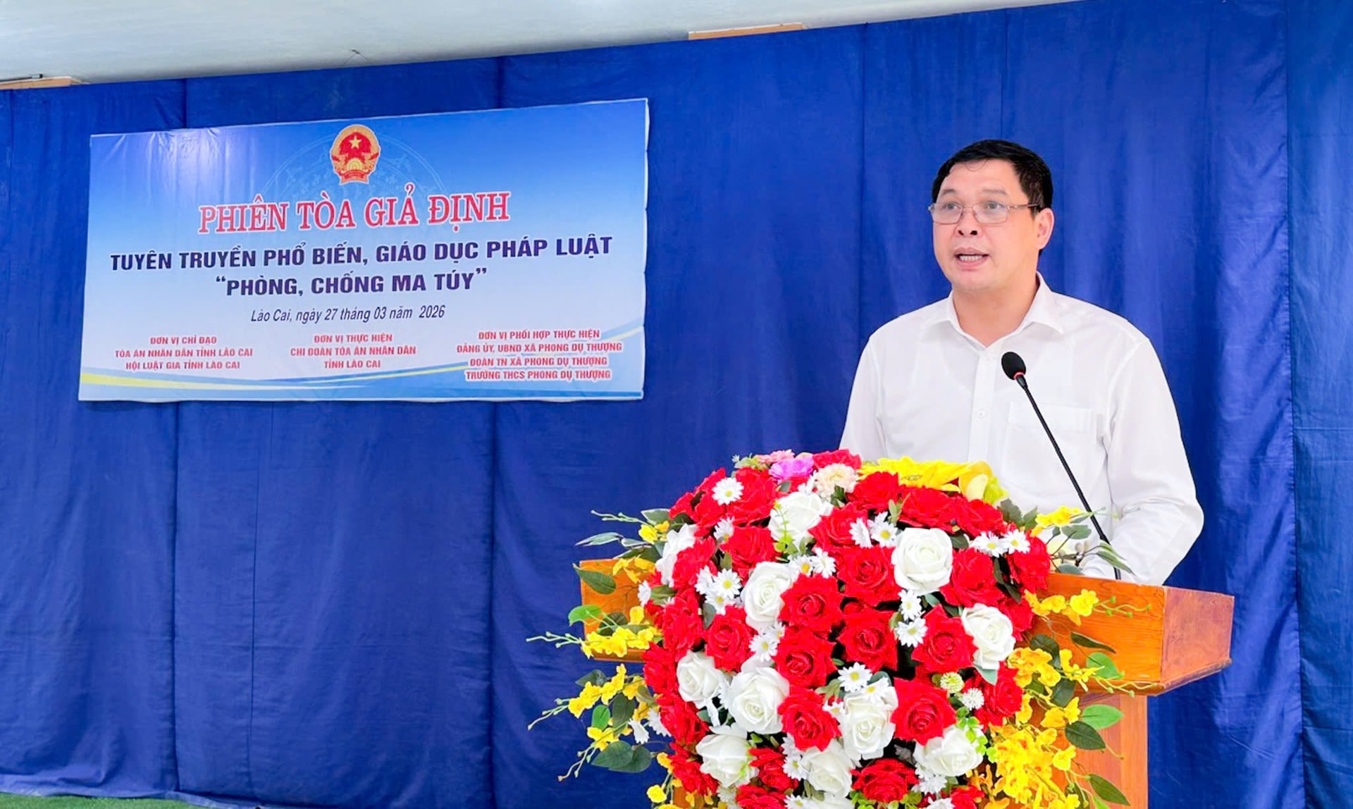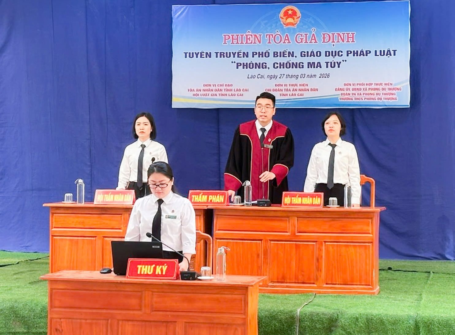 Vừa qua, tại Trường THCS Phong Dụ Thượng, xã Phong Dụ Thượng, tỉnh Lào Cai, TAND tỉnh Lào Cai phối hợp với Hội Luật gia tỉnh Lào Cai chỉ đạo Chi đoàn TAND tỉnh Lào Cai cùng cấp ủy, chính quyền địa phương và các đơn vị liên quan tổ chức chương trình “Phiên tòa giả định - tuyên truyền phổ biến, giáo dục pháp luật về phòng, chống ma túy”. Hoạt động nằm trong khuôn khổ Tháng Thanh niên năm 2026, hướng tới mục tiêu nâng cao nhận thức pháp luật, xây dựng lối sống lành mạnh trong thanh thiếu niên và cộng đồng dân cư.
