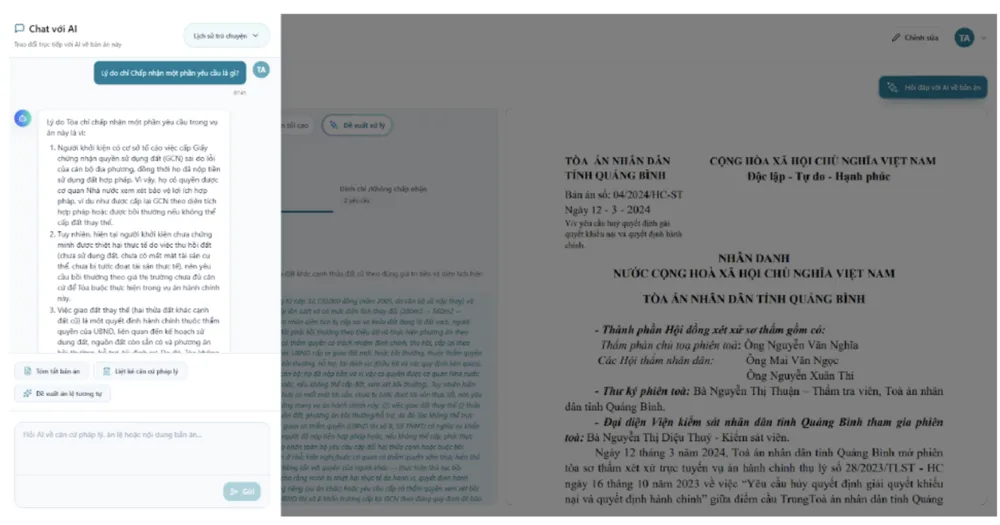 AI tự động phân tích, đối chiếu điều luật, án lệ và hướng dẫn của TAND Tối cao để hình thành căn cứ pháp lý rõ ràng. AI rút ngắn thời gian tổng hợp, hỗ trợ đề xuất nhận định và hướng giải quyết phù hợp. Người dùng đặt câu hỏi và nhận câu trả lời dựa trên dữ liệu pháp lý được đối chiếu. Hệ thống đáp ứng yêu cầu bảo mật hồ sơ tố tụng.