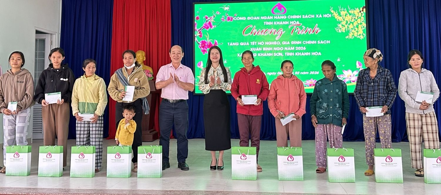 Sáng 6-2, Công đoàn Ngân hàng Chính sách xã hội tỉnh Khánh Hòa tổ chức chương trình tặng 100 suất quà Tết cho hộ nghèo, gia đình chính sách tại xã Đông Khánh Sơn nhân dịp xuân Bính Ngọ 2026.