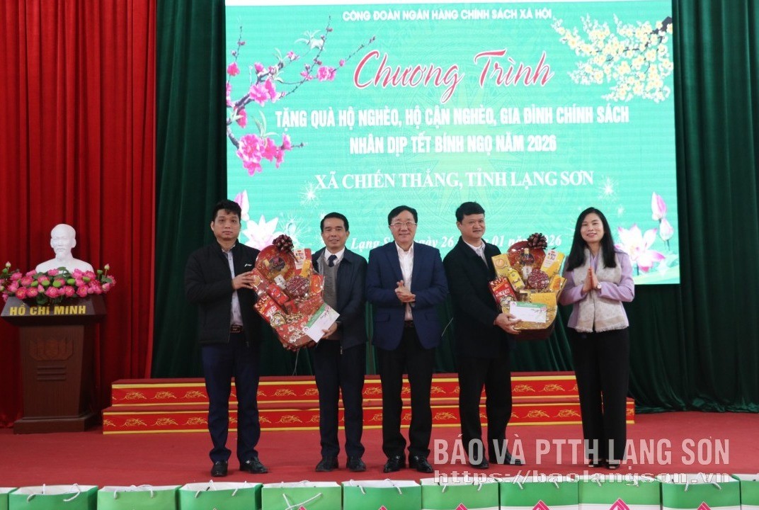 Trong chương trình, đồng chí Dương Quyết Thắng, Ủy viên Ban Chấp hành Đảng bộ Chính phủ, Ủy viên Hội đồng quản trị - Tổng Giám đốc NHCSXH Trung ương và đồng chí Trần Thanh Nhàn, Phó Chủ tịch UBND tỉnh cũng đã tặng quà tết cho xã Chiến Thắng.
