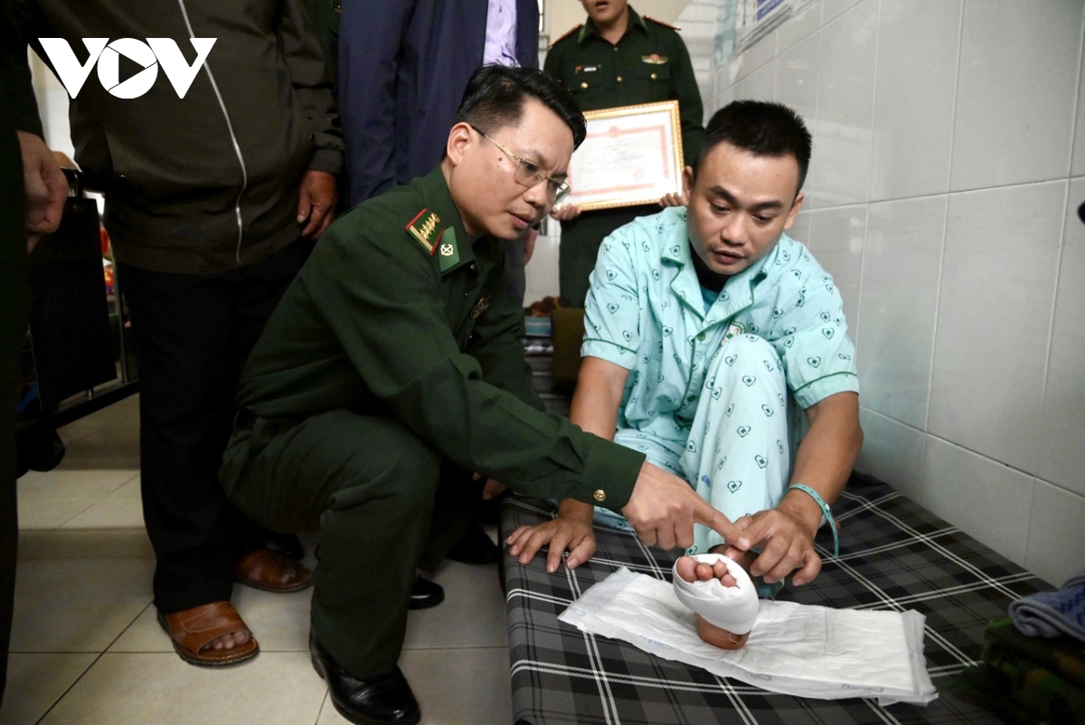 Đại tá Đoàn Ngọc Báu - Chính ủy Biên phòng tỉnh Gia Lai thăm, động viên thiếu tá Nguyễn Khắc Thinh tại bệnh viện