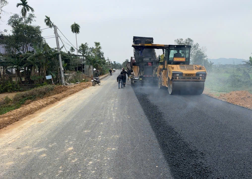 Mặt đường được thảm nhựa, máy móc hoạt động liên tục, công nhân chia ca làm việc từ sáng sớm đến chiều muộn với quyết tâm "còn nắng còn làm", bù lại quãng thời gian tiến độ bị chậm do thời tiết.