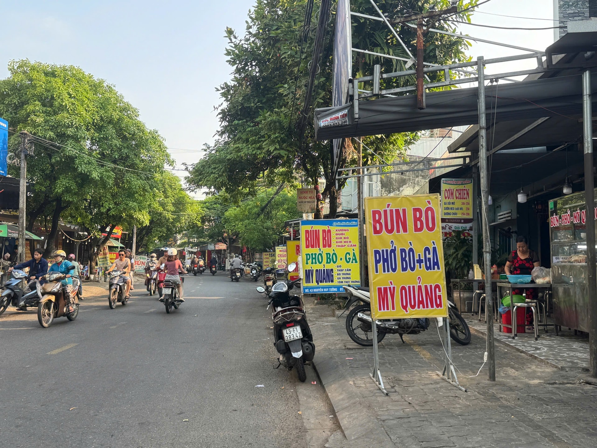 Tuyến đường Nguyễn Huy Tưởng (phường Hòa Khánh), biển quảng cáo, bàn ghế được bày xuống lòng đường, cản trở người tham gia giao thông. Ảnh: TRỌNG HÙNG